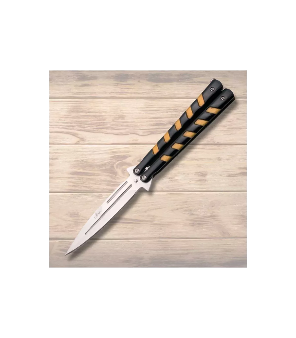 This butterfly-style knife with a hinge system allows for versatile and dynamic use, ideal for displays or collections of enthusiasts of quick-open knife culture. The 'RITMO' logo on the blade supports its quality, complementing a design that combines functionality with aesthetics. The background image with the 'Afon' logo and the mention 'IMPORT & EXPORT' suggests its origin and value as a high-quality import piece, ready to enhance your collection or daily use.