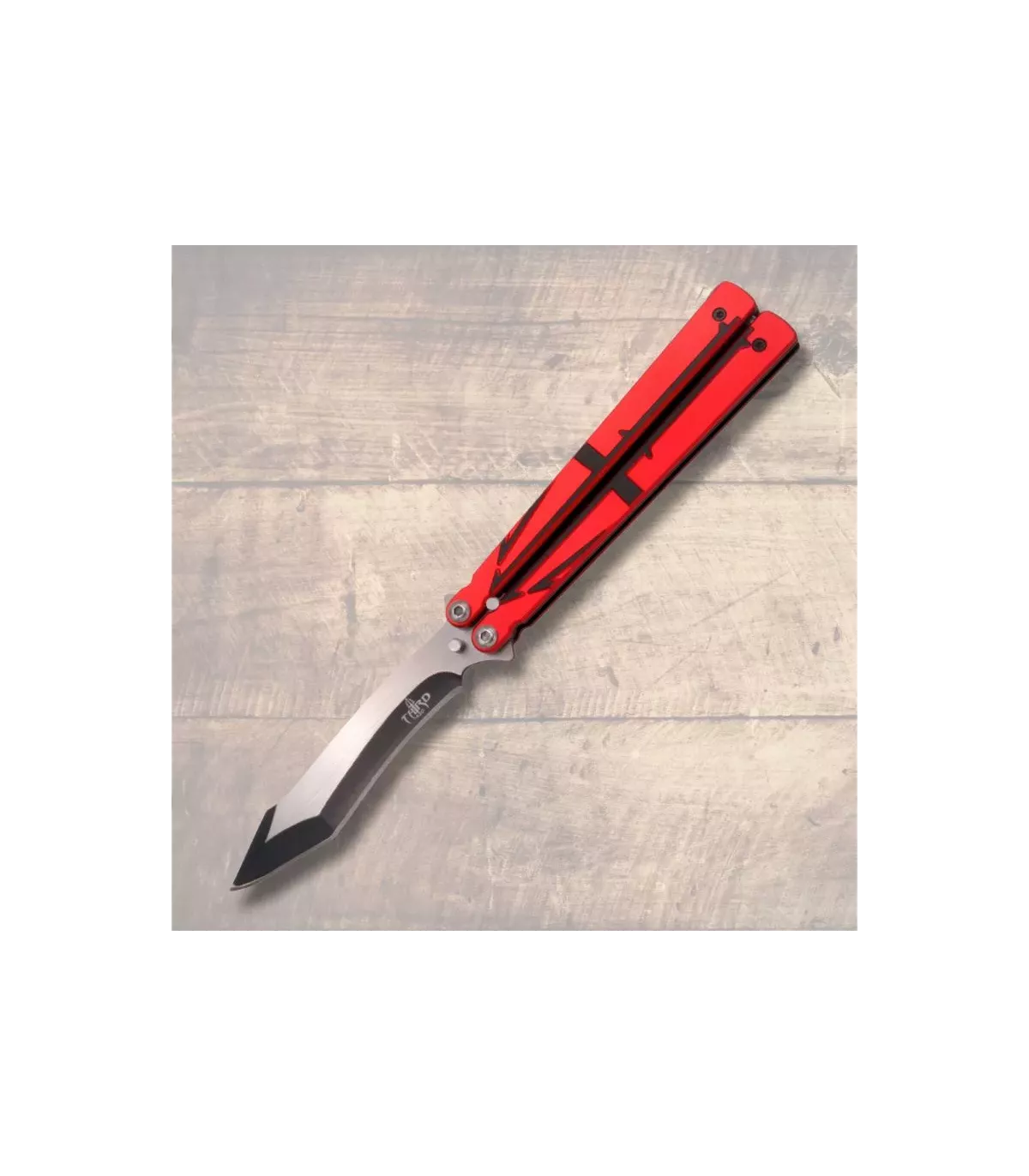 Are you looking for a knife that combines style, precision, and functionality in a single design? This red and black butterfly knife is your best choice to stand out on any occasion. With a satin finish on its 420 steel blade, it offers an elegant and durable line, ready for precise tasks or simply to showcase as a striking accessory.