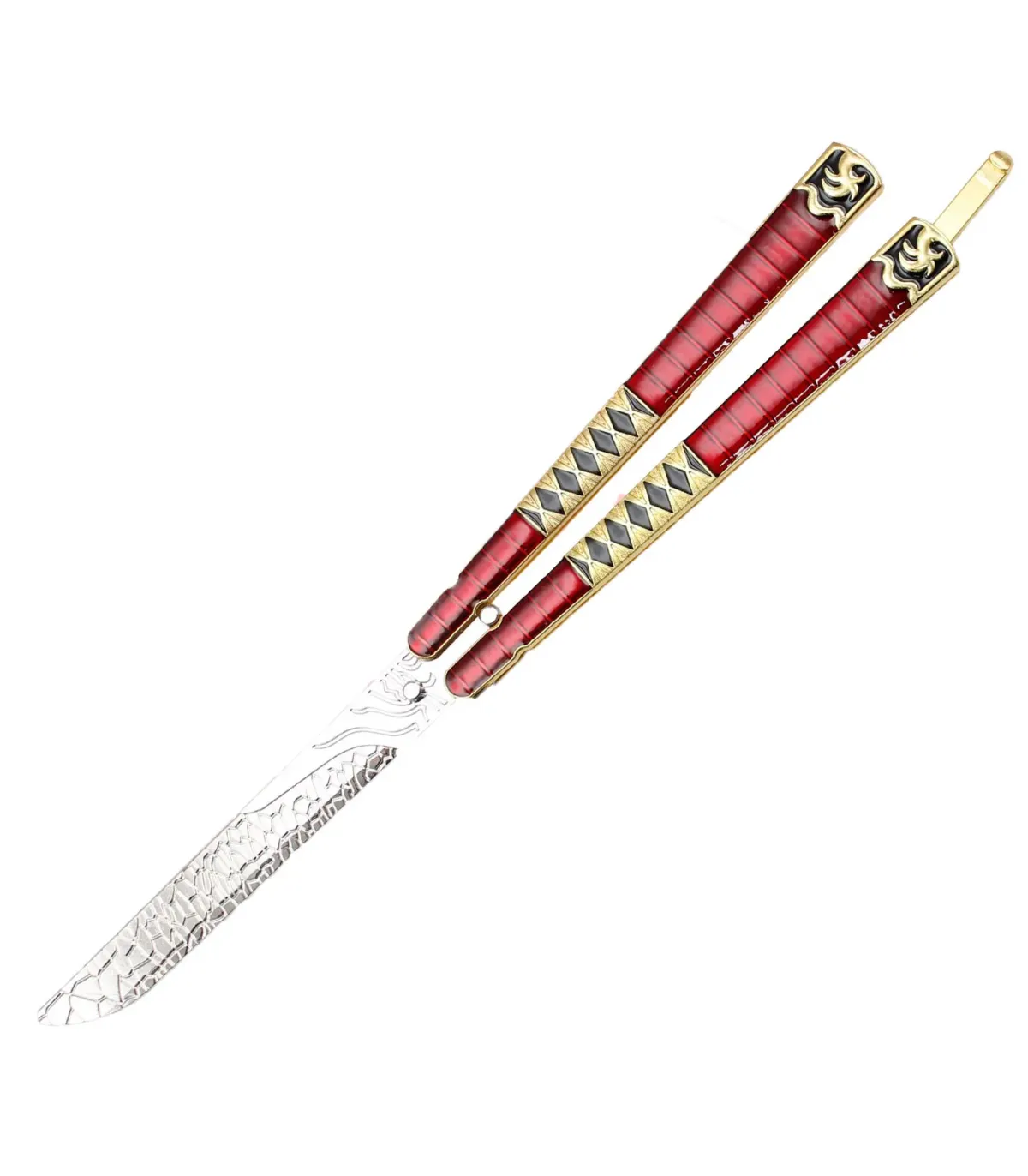 With a design that evokes the elegance of a katana, its zinc alloy handle features a smooth finish in a vibrant red color, adorned with golden details that capture attention. Each embossed section not only adds an aesthetic touch but also provides a comfortable and secure grip, ideal for practicing movements and techniques.