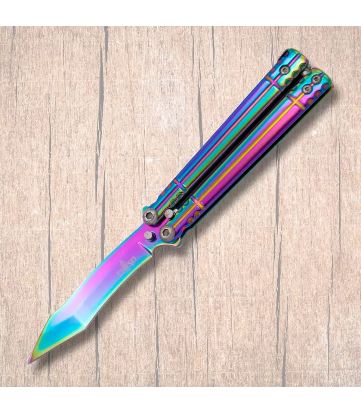 Inspired by the world of collecting and with a design reminiscent of the futuristic and colorful aesthetics of contemporary art, this butterfly knife Third is perfect for enthusiasts of decorative knives or those who enjoy unique and striking pieces. Whether for display in your collection or for practical use, its iridescent finish guarantees it will be the envy of all. Make every movement a statement of style and precision!