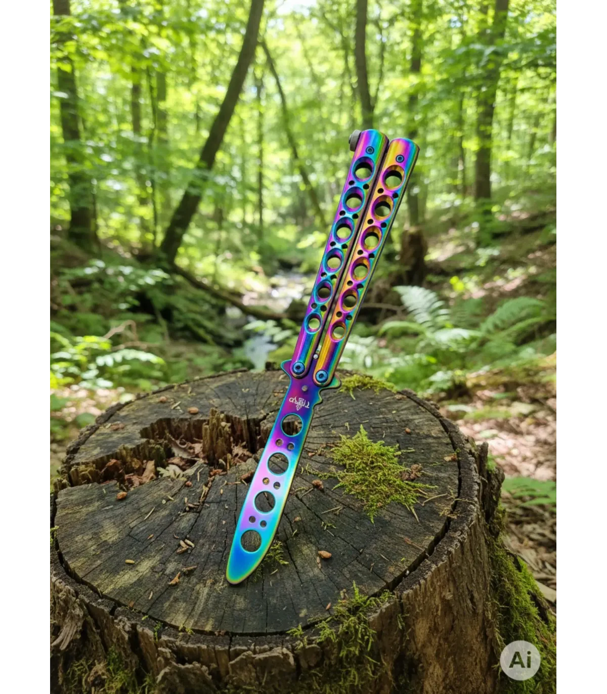 Are you looking for the perfect tool to practice tricks and skills with style? This Rainbow Practice Butterfly Knife Third combines functionality with an eye-catching design that doesn't go unnoticed. Its 420 steel blade with a shiny rainbow finish features a colorful multicolor coating that ranges from blue to pink and gold, adding a vibrant touch to every movement.