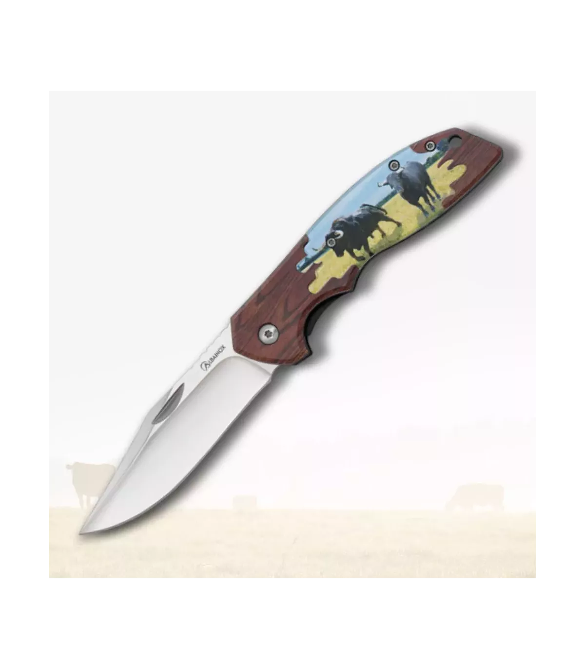 Discover the perfect combination of functionality and design with this decorated knife from Albainox. Ideal for both your outdoor activities and to showcase in a collection, this model stands out for its detailed design of bulls in a prairie setting. Its 3D image and the earthy colors of the handle that imitate wood make it a unique piece reflecting strength and tradition.