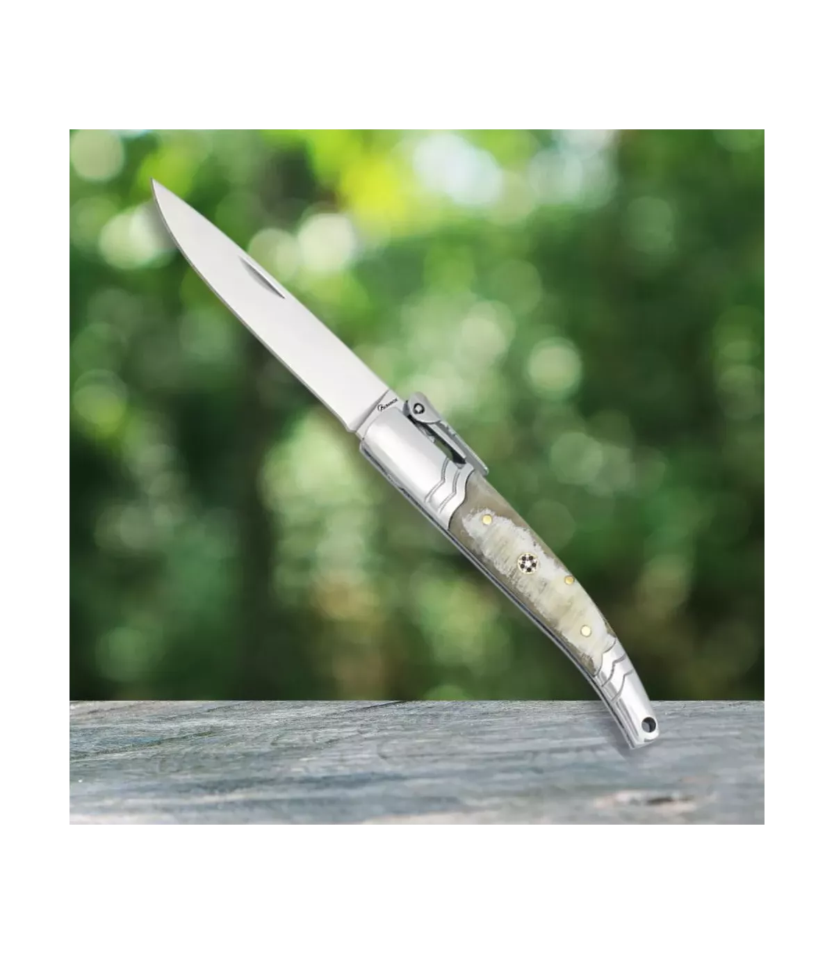 The handle, decorated with a horn handle, features ornamental details that give it a sophisticated character. Its design is not only visually attractive but also ensures a comfortable and firm grip for prolonged use. Complemented with a locking system operated by a palisade, you can operate this knife with complete confidence and ease.