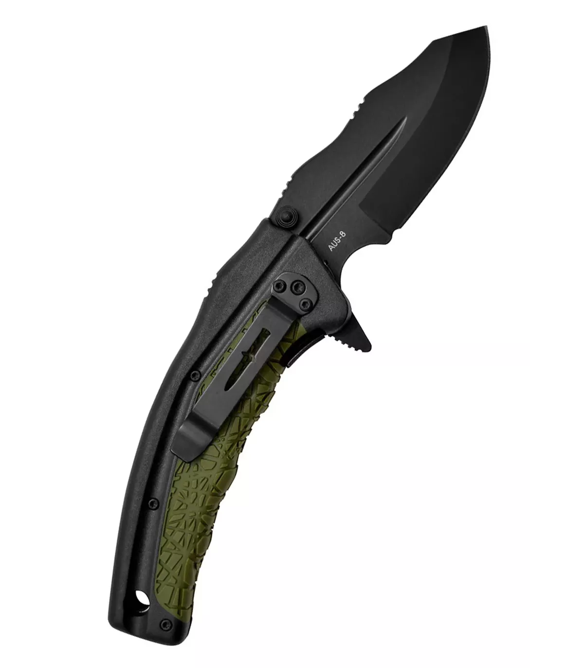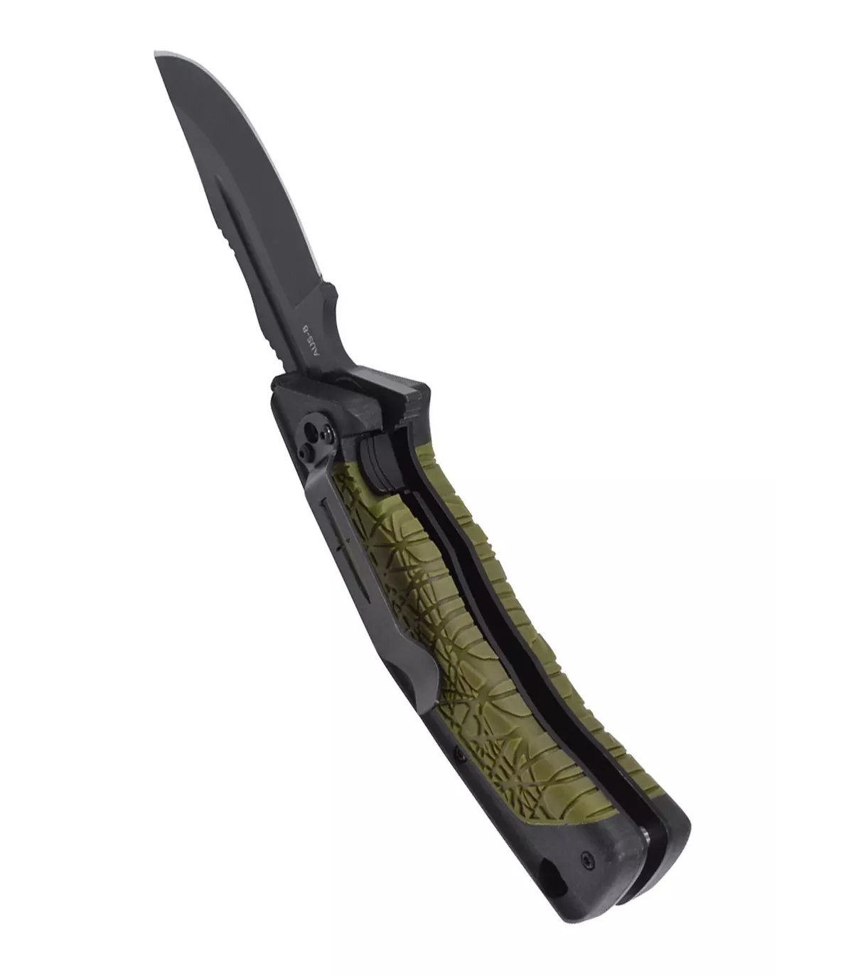 - Mango ergonómico y antideslizante: El mango está hecho de nylon reforzado con fibra de vidrio (GFN) con inserciones de TPE para garantizar estabilidad y un agarre excelente en todas las condiciones. Su diseño de dos tonos en negro y oliva con un patrón geométrico no solo es atractivo a la vista, sino que también proporciona funcionalidad y estilo.