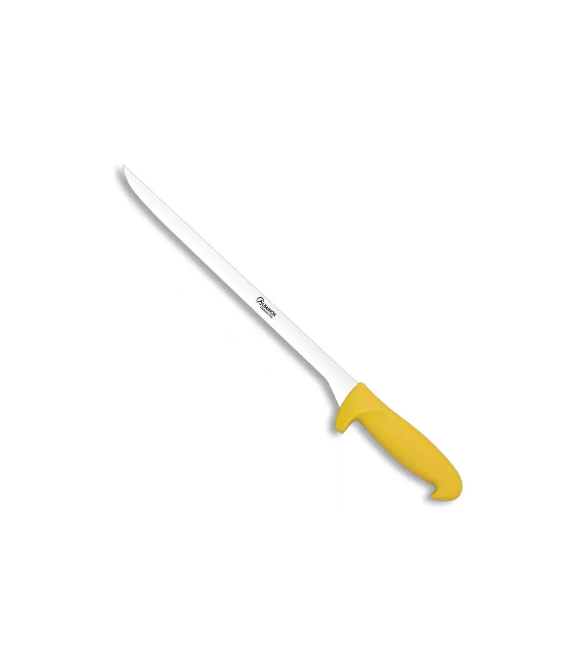 Awaken your culinary senses with the Albainox ham slicer knife! This extraordinary knife, featuring a 300 mm stainless steel blade, will become your inseparable companion in the kitchen. Its unique design, combining the elegance of stainless steel with a yellow ABS handle, ensures a firm and comfortable grip, facilitating precise and effortless cutting.