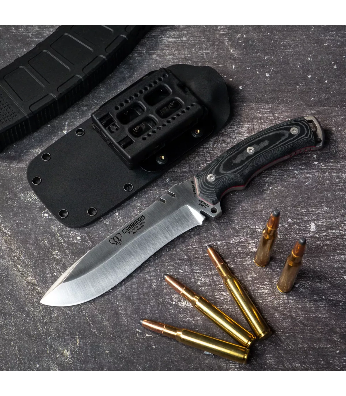The Cadet Green Beret Hunting Knife with black micarta handle and Kydex sheath is an essential tool for any experienced hunter. Made with a hollowed blade of 15 cm in length and 5 mm thick, this knife is sturdy and durable.