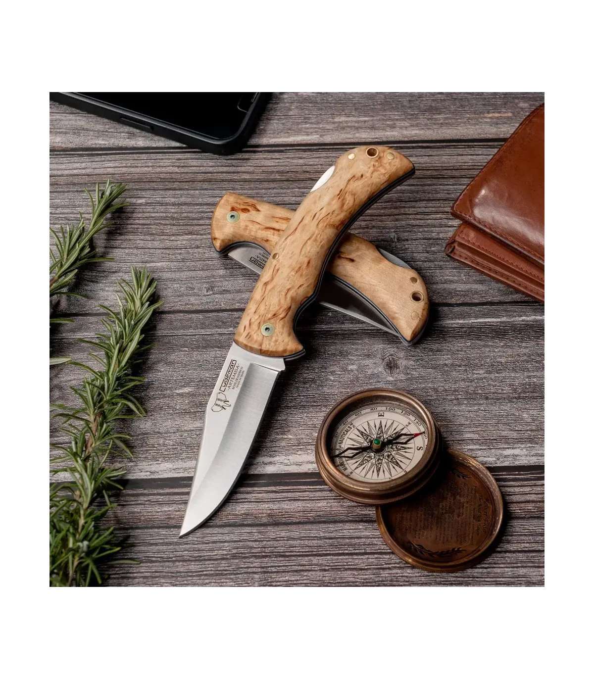 Discover the hunting knife with a curly birch handle, a masterpiece entirely made in Albacete, Spain, using the finest materials and impeccable craftsmanship! This knife combines elegance, functionality, and quality in every detail, becoming your essential tool for outdoor adventures.