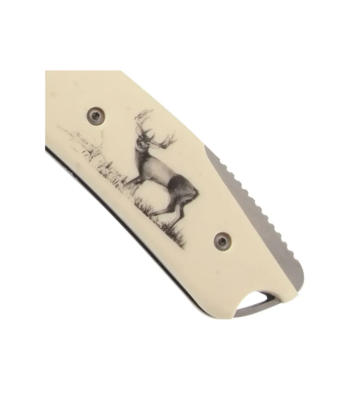 • Wood and ABS Handle: The handle is constructed with a combination of wood and ABS, providing a blend of durability and aesthetics. The deer decoration adds a unique and thematic touch to the knife.