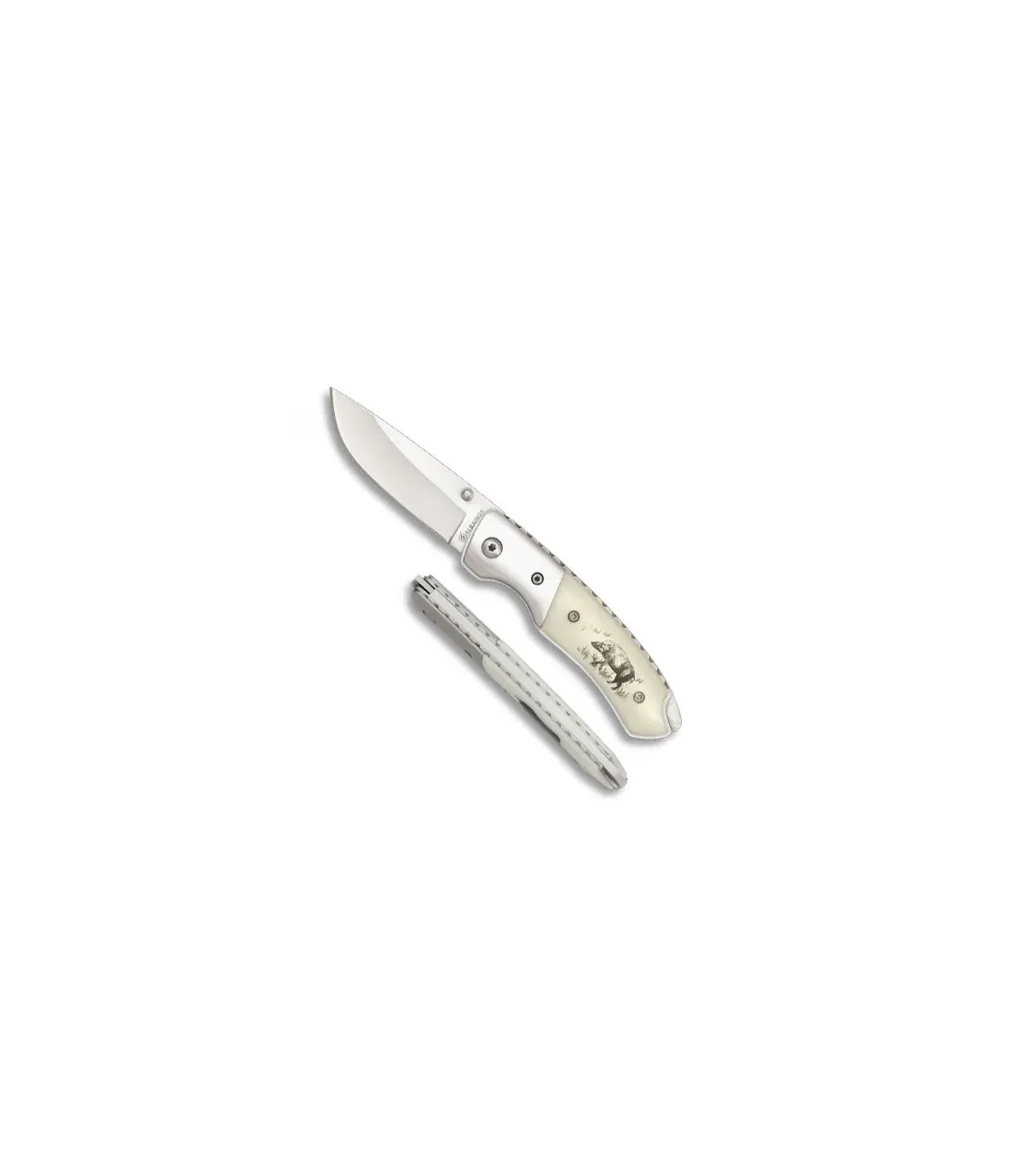 - White ABS Handle Decorated on Both Sides: The white ABS handle, decorated on both sides with a wild boar, is visually appealing and provides a comfortable and secure grip, facilitating handling.