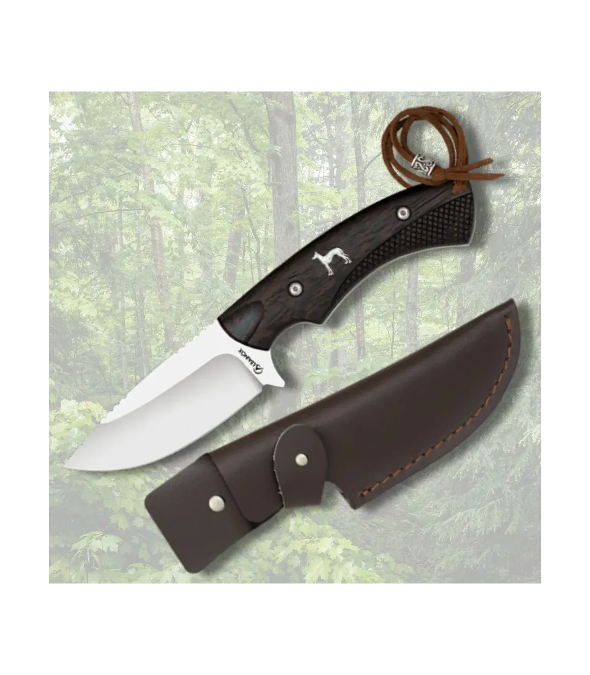 The handle, with its elegant dark-colored design and wood-like texture, offers a comfortable and secure grip. Additionally, the engraving of a dog on the handle adds a personal and distinctive touch, evoking the connection with nature and hunting. The rubber bottom provides additional support, ensuring the knife remains firm in your hands, even in the most demanding conditions.
