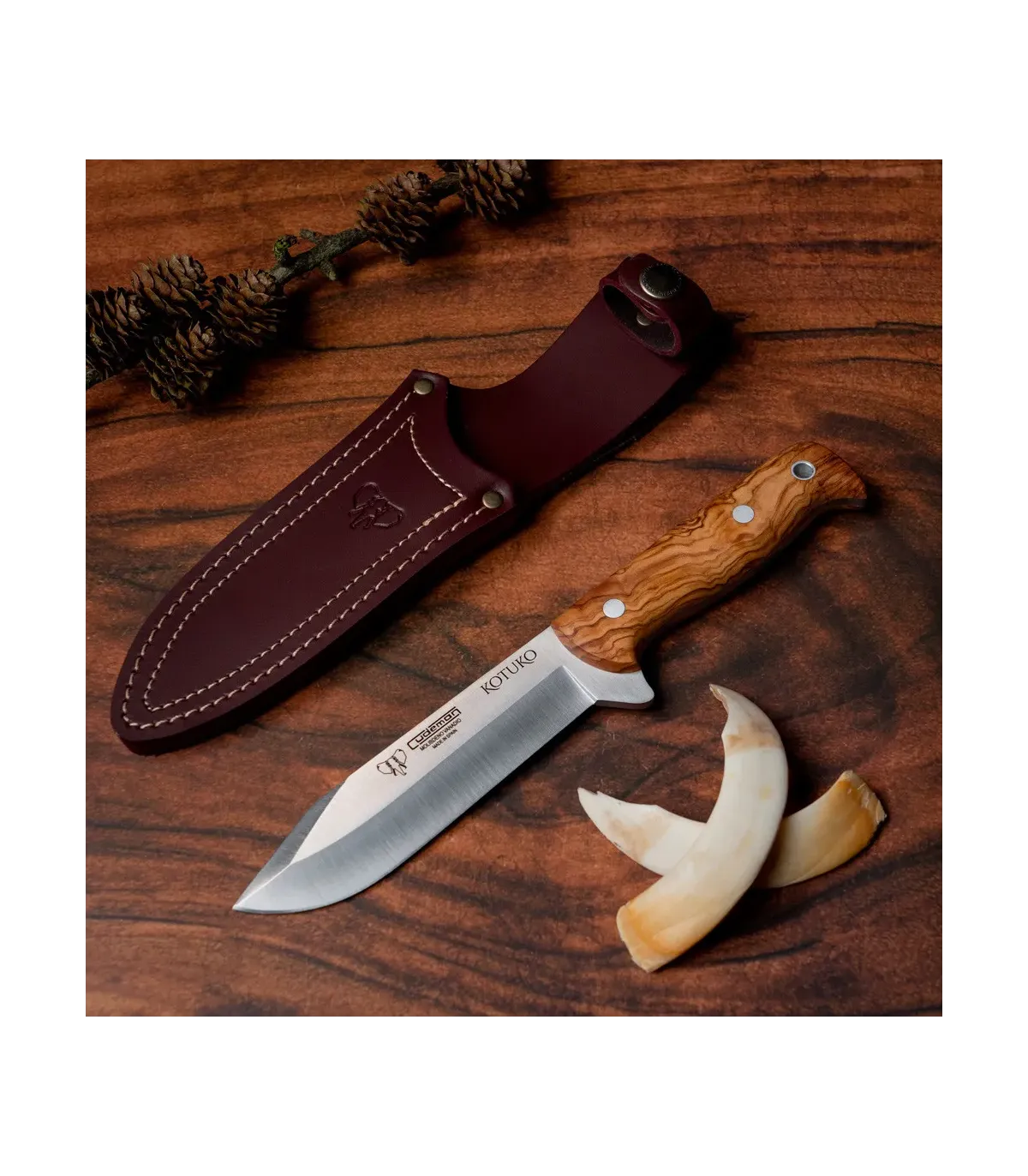 This hunting knife comes with a leather sheath, which not only protects the blade from the elements but also allows you to carry it safely and comfortably. The combination of olive wood and leather sheath highlights the beauty and functionality of this knife, making it an essential accessory for passionate hunters.