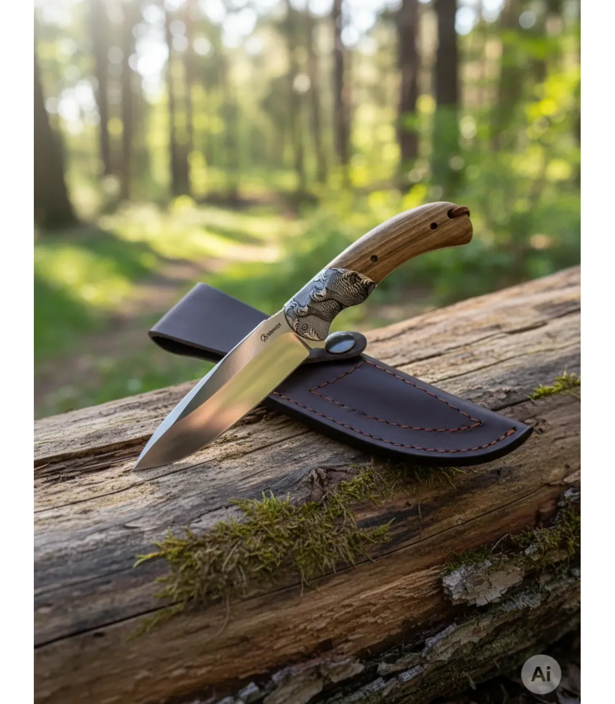 Its blade, made from durable 3CR13MOV steel, features a satin finish that not only provides a sophisticated look but also makes it easy to maintain and resistant to the rigors of daily use. The handle, crafted from wood with decorative engravings and in natural tones, offers a comfortable and secure grip, enhancing its artisanal and unique character.