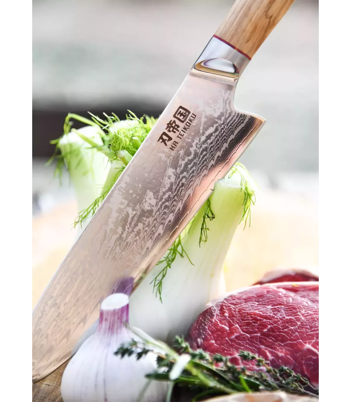 Santoku kitchen knife with a 67-layer Damascus steel blade. The sharp edge of this kitchen knife allows you to perform virtually all cutting tasks quickly and easily. The elegant olive wood handle comfortably fits the hand and provides a secure grip while cutting. This knife is part of our own collection of kitchen knives, Ha Teikoku. Since olive wood is a natural product, variations in color and grain are quite normal, making each knife a unique piece with its own characteristics and patterns.