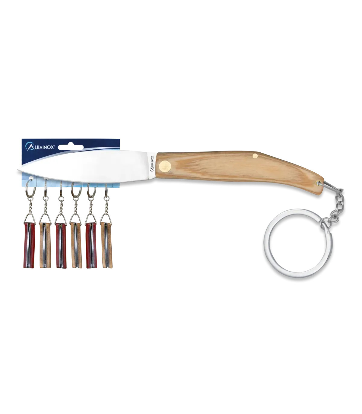 The Albainox Brand Keychain Knife with assorted colored handle, blending natural wood and red, is a practical and versatile tool that you can always carry with you. Here is a detailed description:
