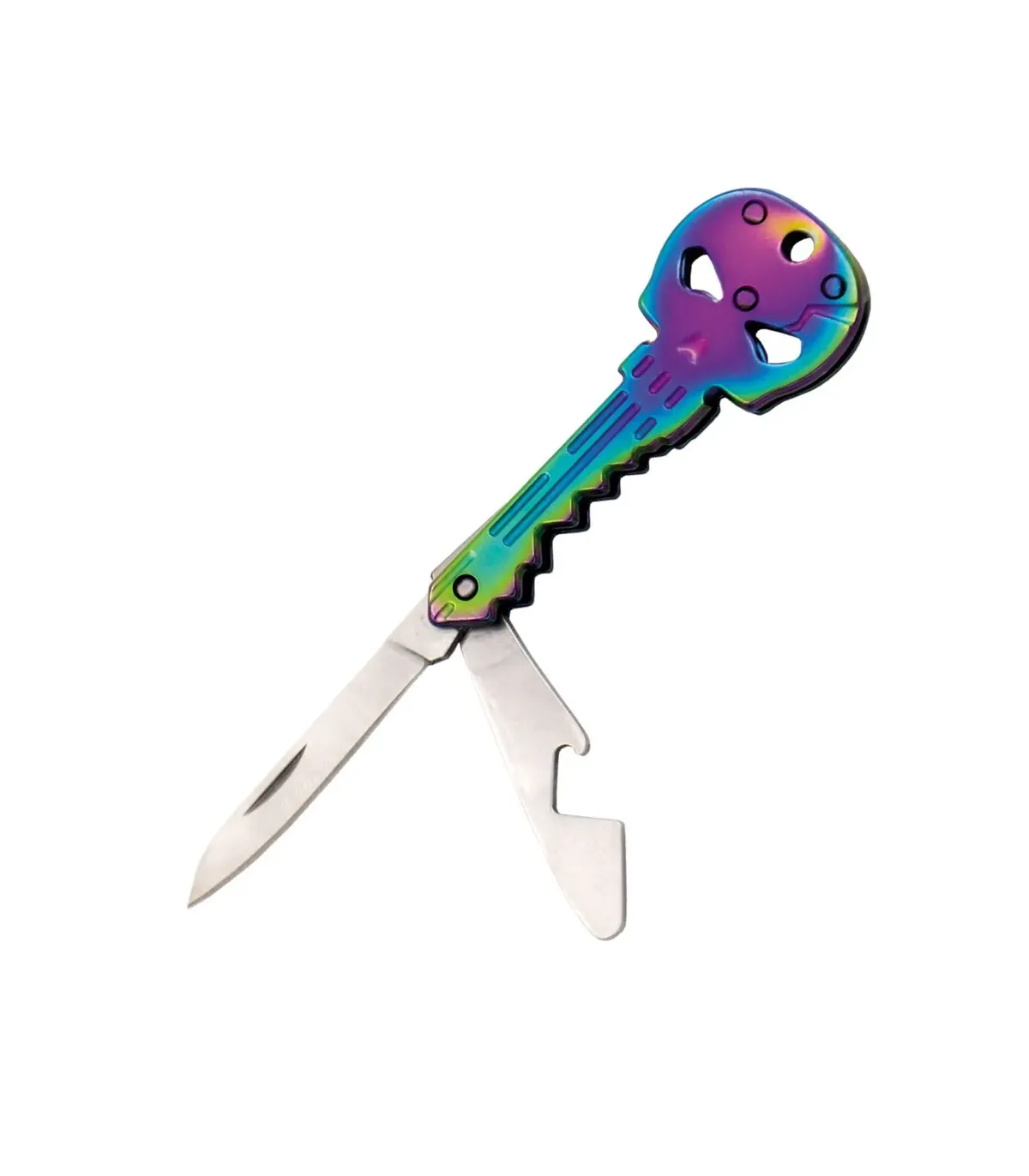 Enjoy the functionality and style of the Skull Keychain Third. Its compact design, combined with the hidden razor and bottle opener inside a key, makes it a unique and practical accessory. The rainbow finish adds a splash of color and personality. Discover the quality and originality of the Spanish brand Third in this multifunctional keychain!