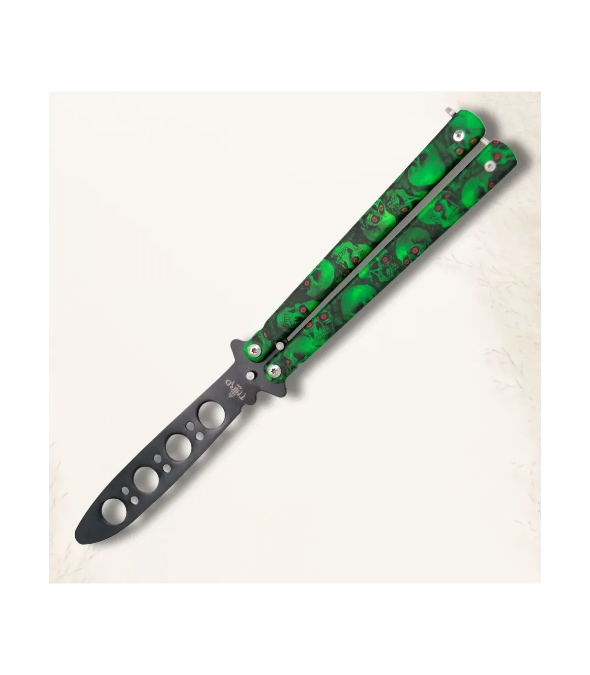 Green skulls folding knife practice without edge