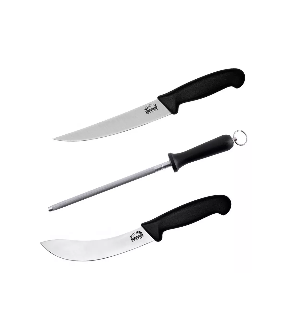 The Samura Butcher set consisting of 3 pieces is the perfect kit for all general butcher tasks. This set includes two sturdy butcher knives with blades made of AUS-8 stainless steel, specifically designed to cut and prepare meats efficiently and precisely.