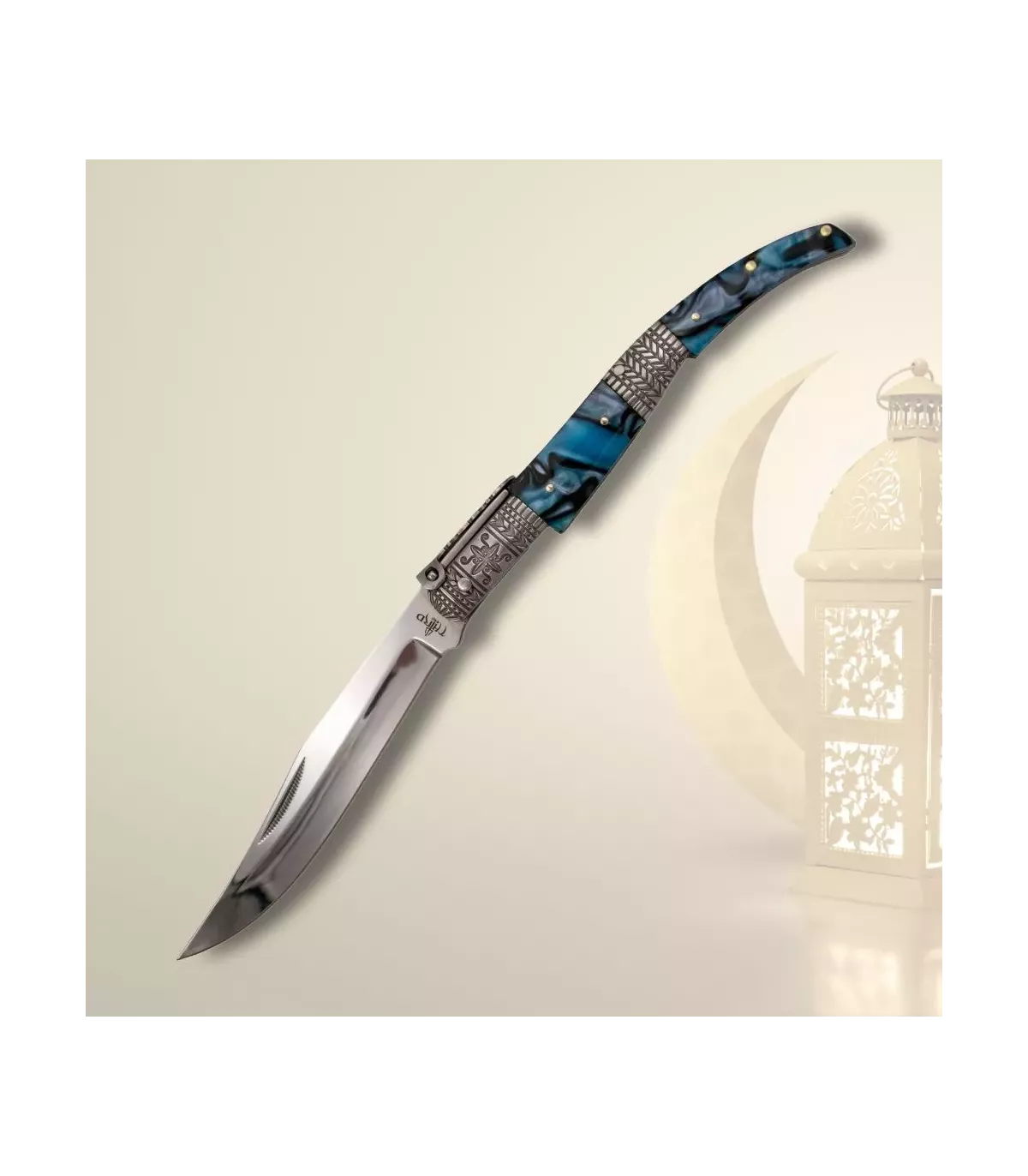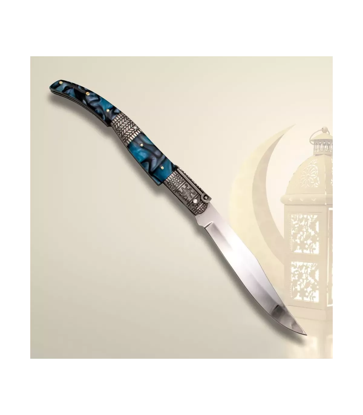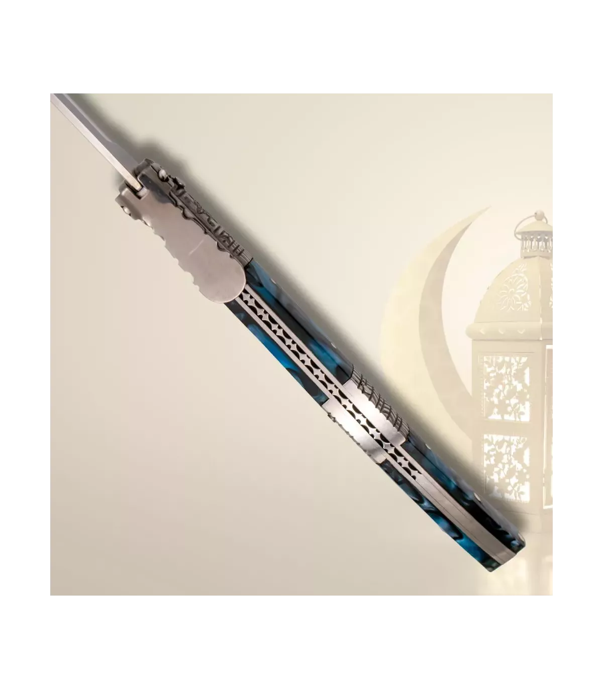 Its handle, a fusion of stainless steel with blue acrylic inserts, is meticulously designed with a decorative low relief, inspired by the classic Spanish knives of the 19th century. This not only guarantees a comfortable and secure grip but also turns each use into an authentic homage to the artisanal heritage of the past.