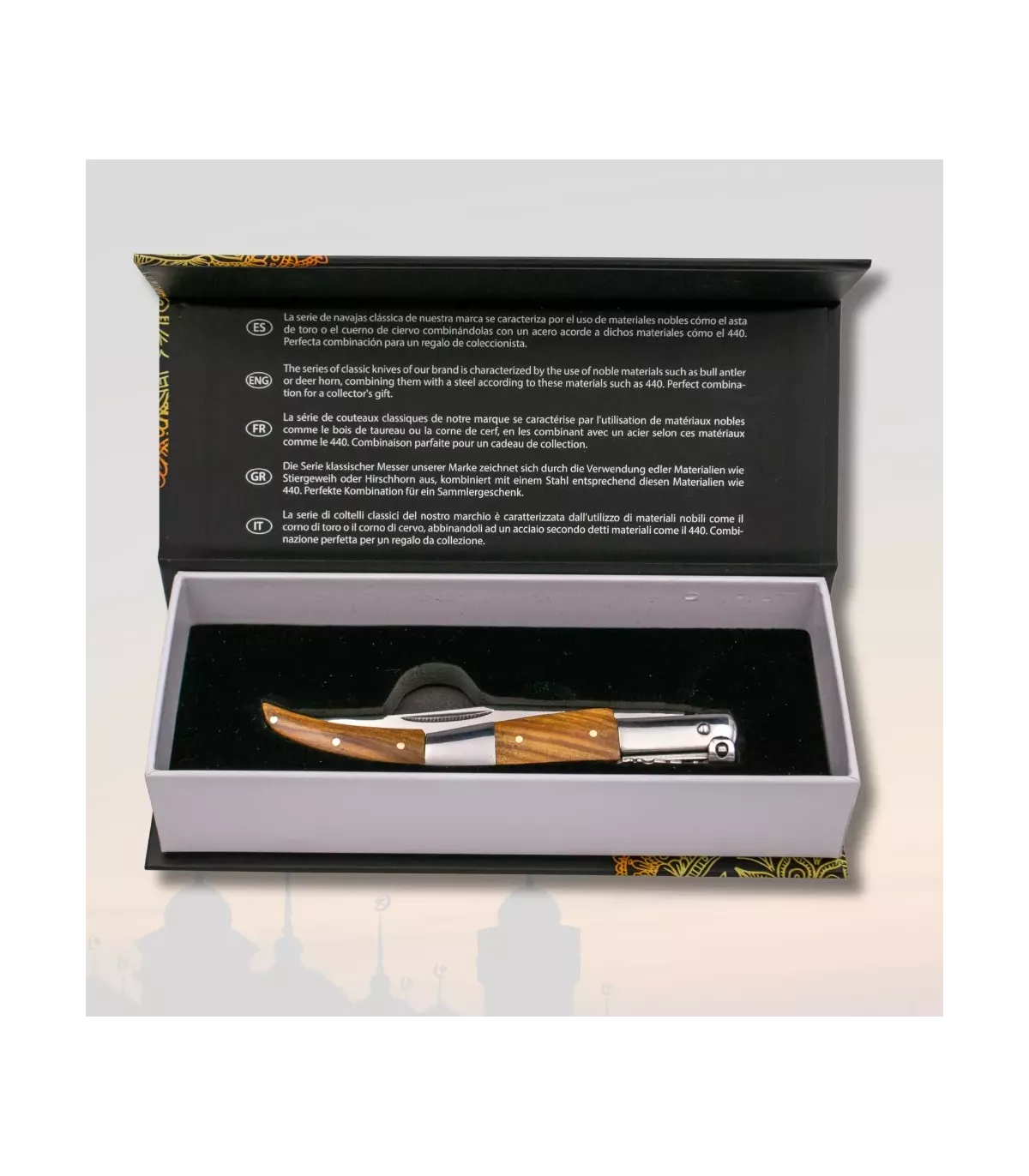 Additionally, the opening and closing mechanism, decorated with a spring and a pin, ensures smooth and safe operation, allowing you to enjoy its use without worries. For those who value presentation, it comes in an elegant box, perfect for gifting or displaying in your collection.