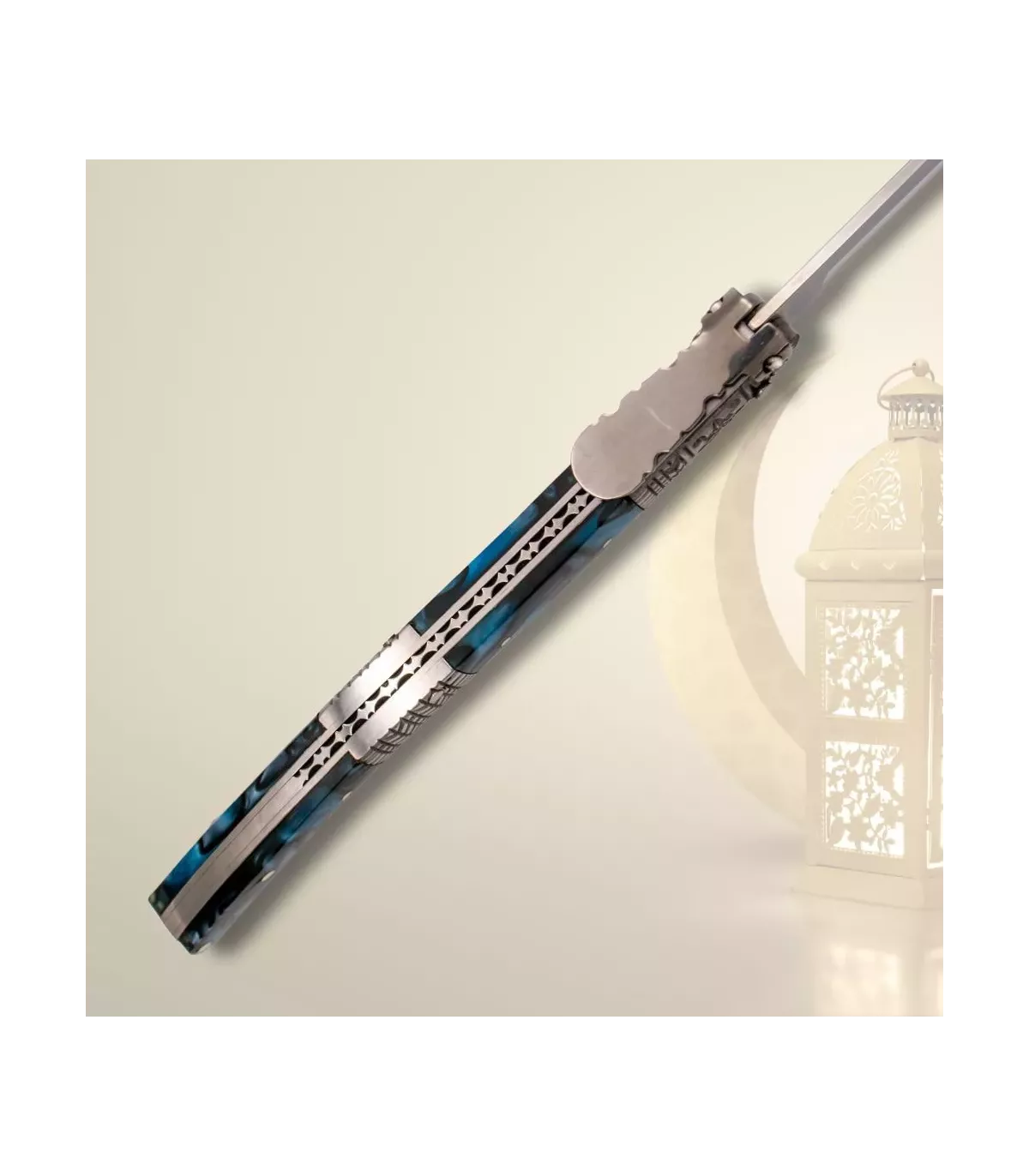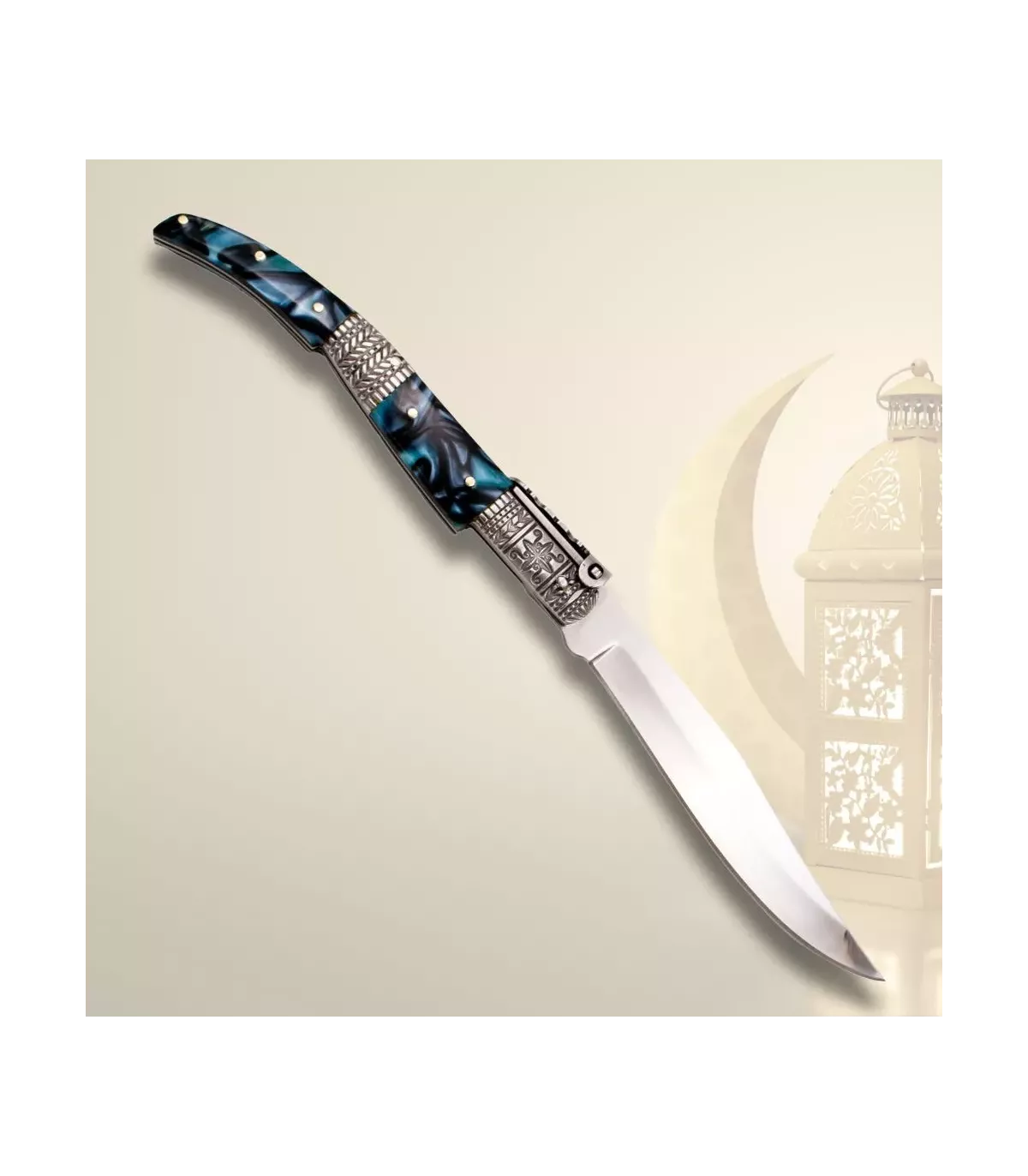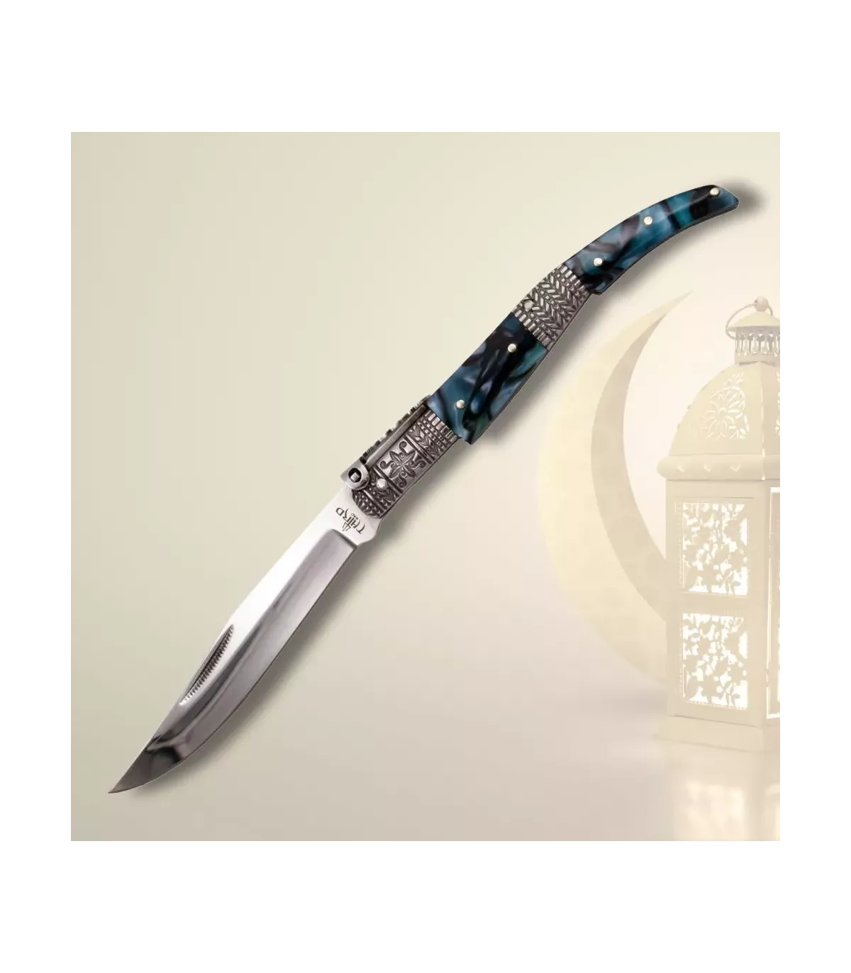 Made with CNC technology, this Arabic pocket knife is the result of meticulous engineering that emphasizes the finesse of every detail. Its handle, crafted from stainless steel with delicate blue acrylic inlays, offers not only an impressive aesthetic but also a comfortable and secure grip, allowing each action to be smooth and precise.