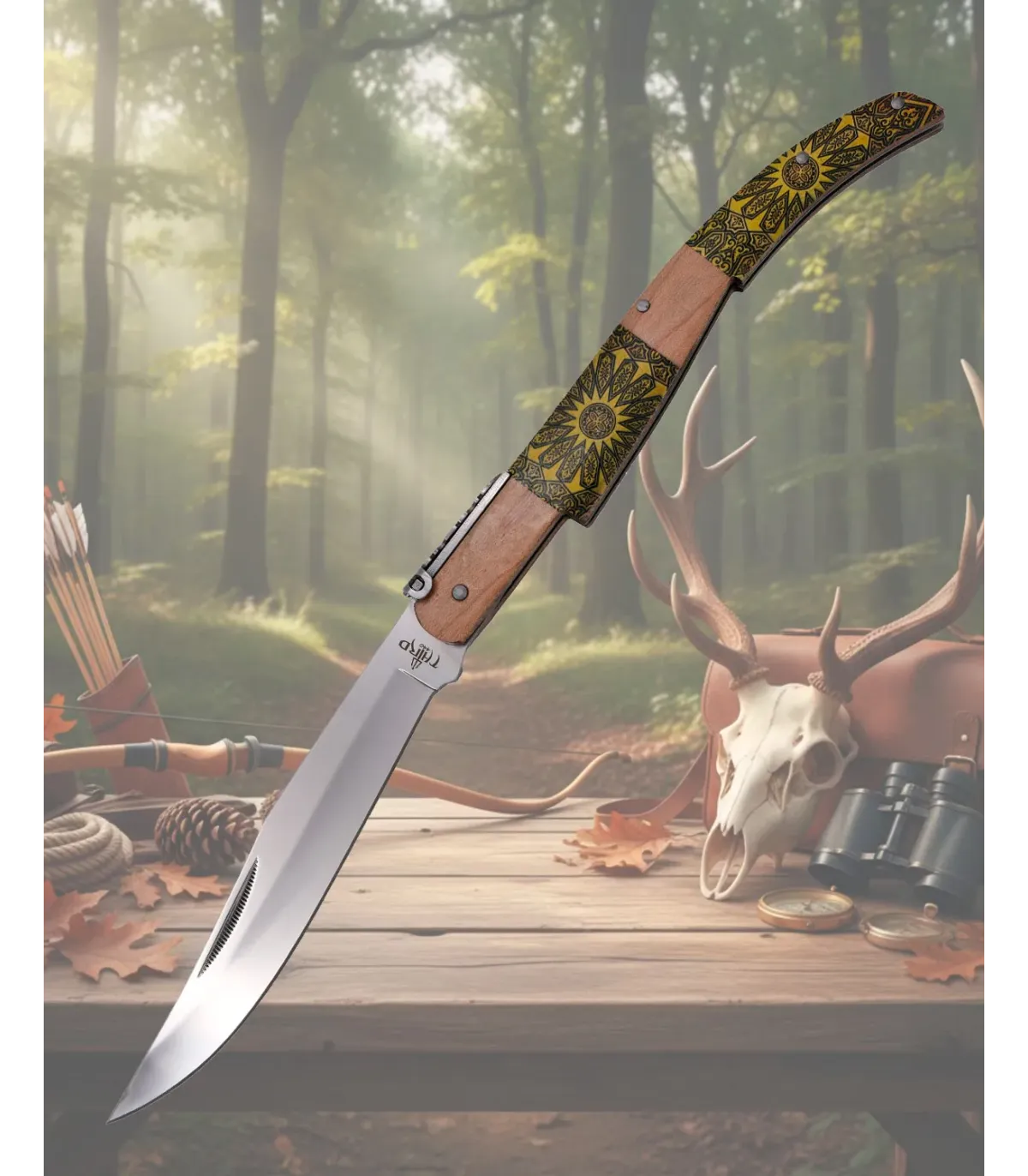 The manual locking mechanism and decorated spring ensure the blade stays firmly in the open position, providing confidence during use. Visible rivets and the ornamented toggle reinforce the sense of solidity, combining aesthetics and functionality in every detail.