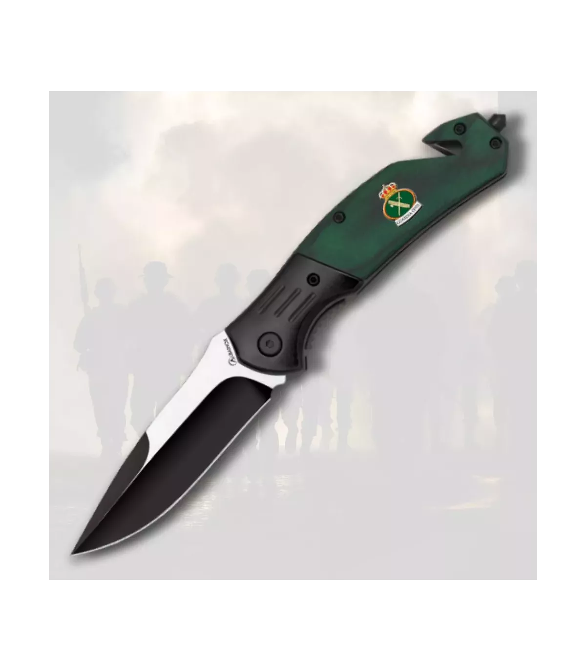 Discover a practical, functional, and characterful tool. This rescue knife, designed by Albainox, is much more than a simple utensil: it is a tribute to the Civil Guard, reflected in its emblematic logo with crown details and institutional symbols that stand out on its durable green handle.