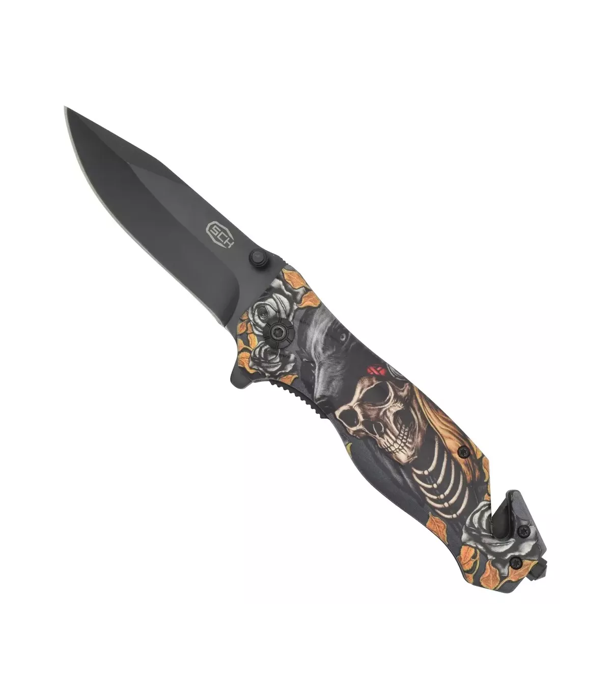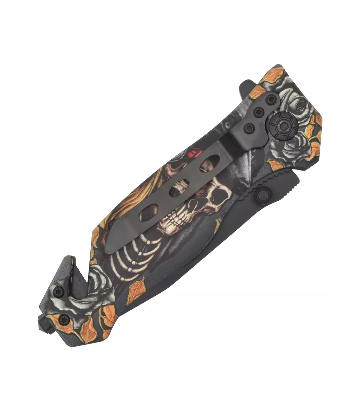 The SCK Skulls rescue knife is the perfect tool for those seeking to combine extreme functionality with a unique and bold design. Designed with safety and efficiency in mind, this folding knife is ideal for any emergency situation, offering features that can make a difference when you need them most.