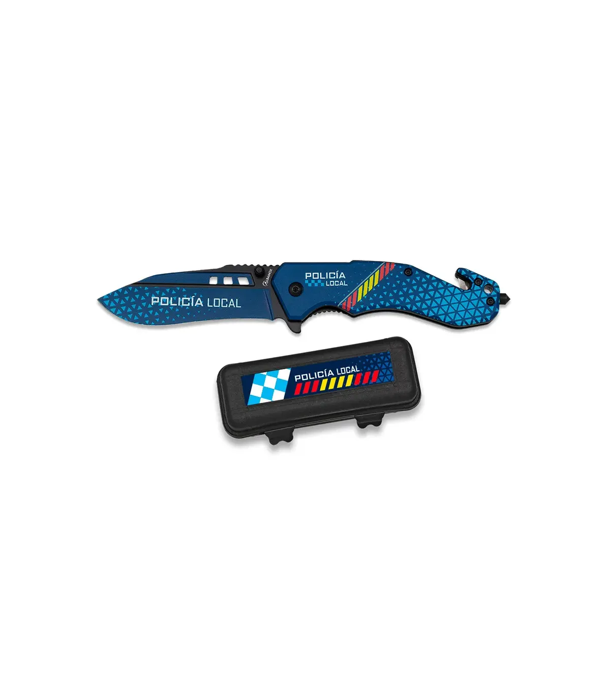 Navaja táctica de rescate diseño 3D negro POLICÍA LOCAL con bloqueo tipo Linear lock. Caja rígida en ABS con diseño a juego. Incluye: