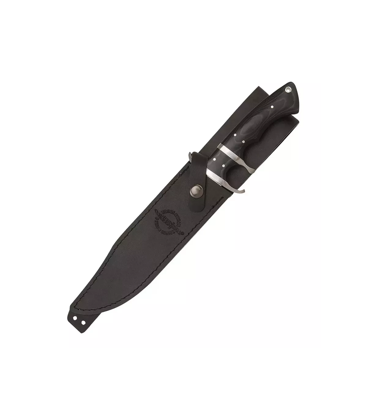 The Gil Hibben handle is designed to provide a comfortable and secure grip in any situation, whether for outdoor activities or daily use. Additionally, the knife comes with a personalized tooled leather sheath bearing the manufacturer's logo, allowing you to carry it anywhere with style and elegance.