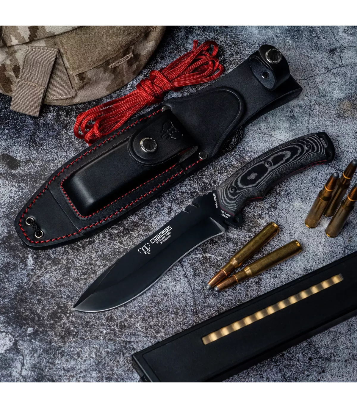 The one-piece structure and handle attachment with stainless steel Allen screw and threaded brass internal collar make it even more durable. The included black leather sheath is sturdy and allows for safe transport. Furthermore, it features a series of useful extras, such as a lanyard loop, glass breaker, wire cutter, bullet encapsulator, and a rim zipper to ensure a better grip.