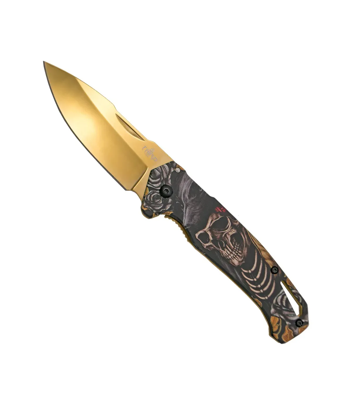 Express your style with the Dorado Third Design 3D Skull Tactical Knife. This unique piece combines bold design with superior functionality. The steel handle is adorned with a detailed 3D skull print on one side, while the other side is plated in shiny gold titanium, offering a dazzling and sophisticated finish.