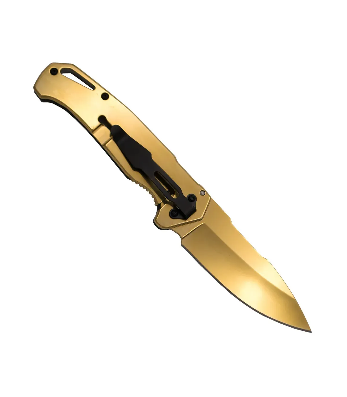 The 420 steel blade, measuring 8.5 cm, is also plated in shiny gold titanium, providing exceptional resistance to wear and corrosion. This finish not only enhances the durability of the blade but also gives it a striking and distinctive appearance. The liner lock system ensures that the blade remains stable and secure during use, increasing safety with every action.