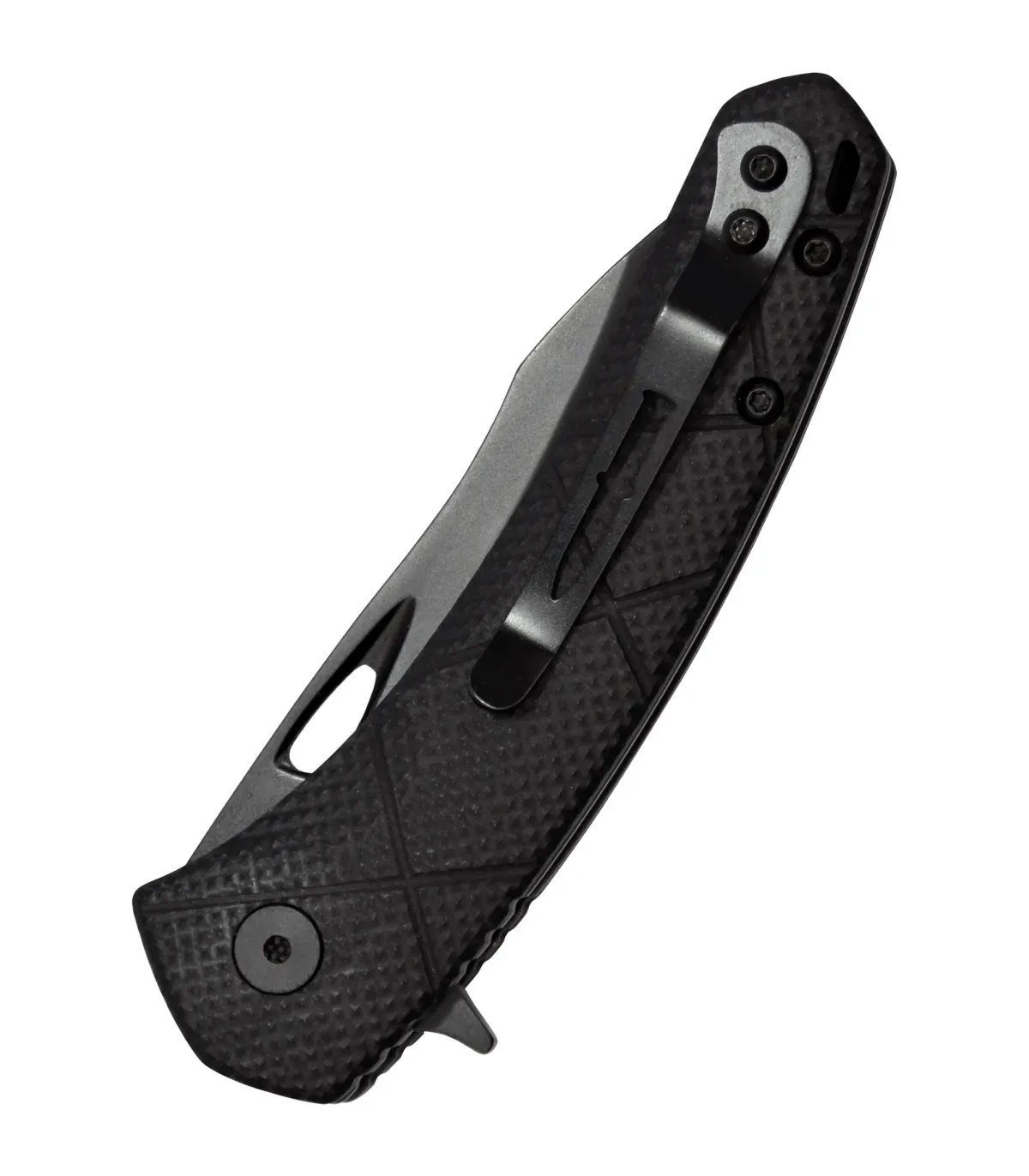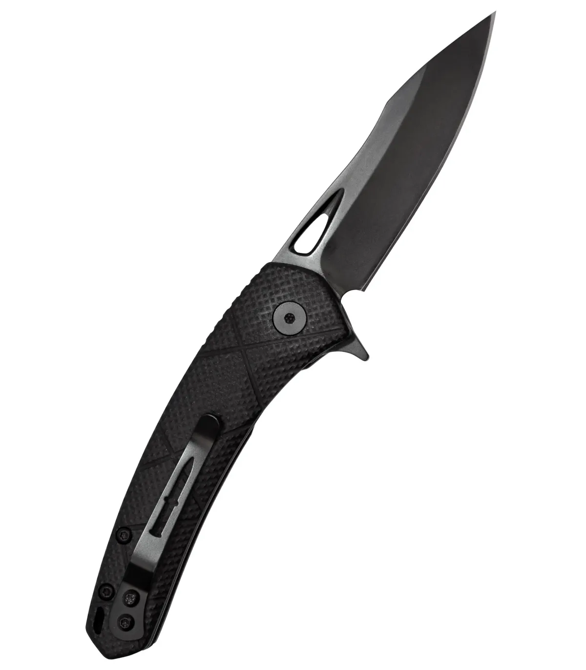 - Ergonomic G10 handle: The black handle is made of G10 and is ergonomically designed to provide a secure and comfortable grip in all conditions. With a textured surface, it guarantees optimal control with every movement. Additionally, it features a steel belt clip and a lanyard hole for convenient portability in any situation.