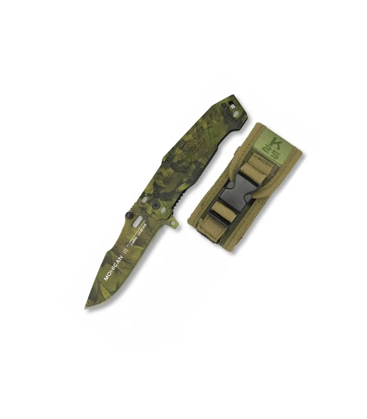 - Rubberized Aluminum Handle in Green Camo: The rubberized aluminum handle in green camo is not only visually appealing but provides a comfortable and secure grip, ensuring the knife feels good in your hands, even in adverse conditions.