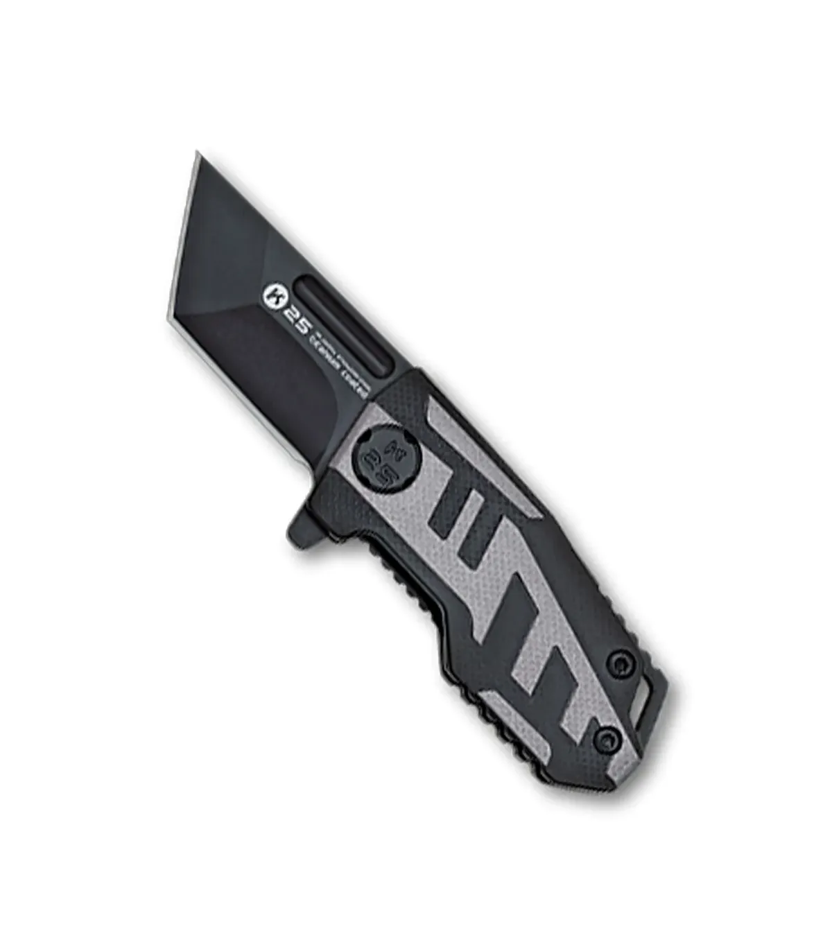 Are you looking for a reliable tool with a modern style for your most demanding tasks? This K25 tactical knife with a black and grey handle is the perfect choice. Thanks to its 7CR17MOV steel blade with a black titanium finish, it combines corrosion resistance and exceptional durability, ensuring reliable performance over the long term.