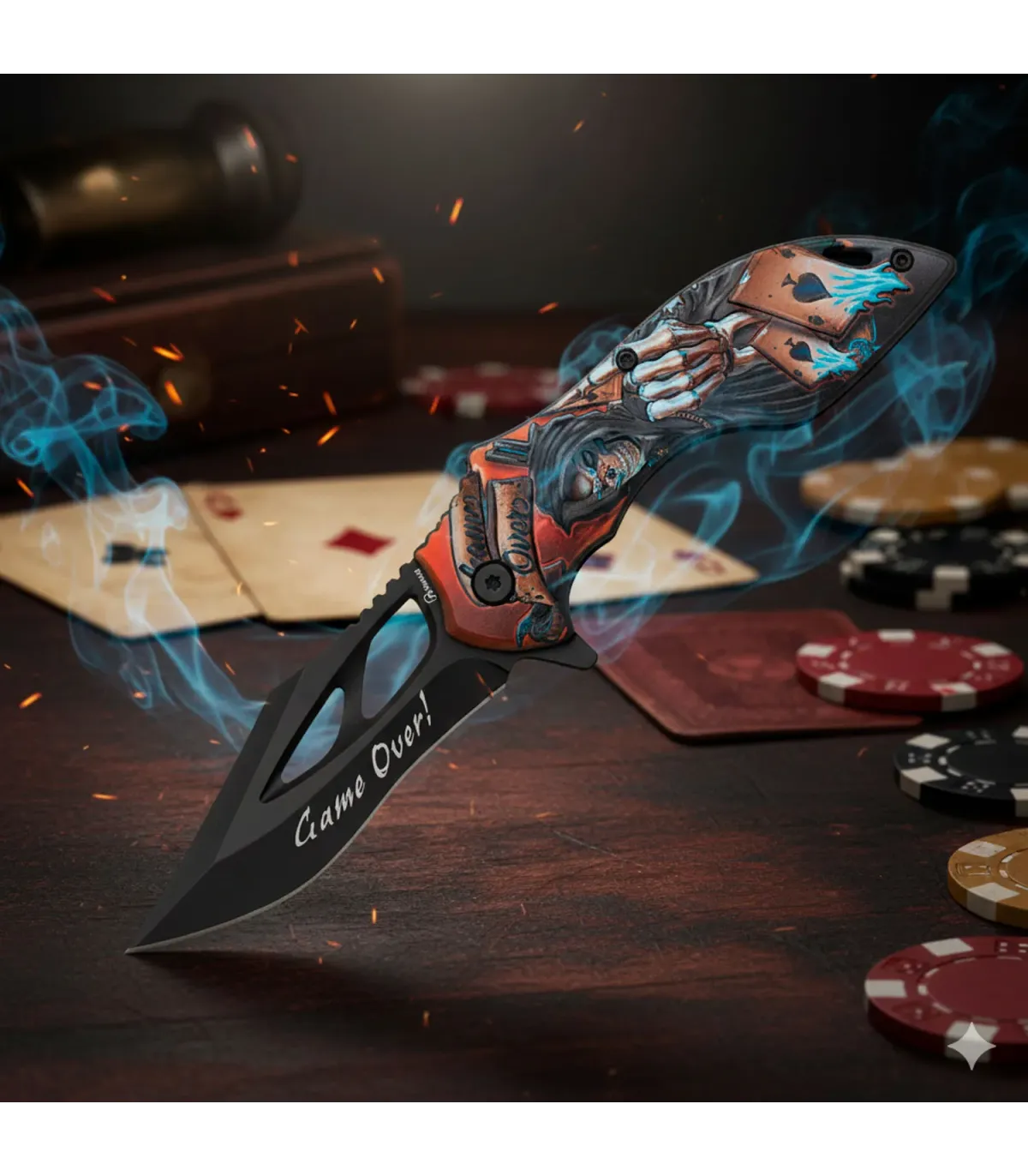 The ABS handle features a 3D design with thematic illustrations of skulls, cards, and the phrase 'Game Over!', providing a unique and eye-catching style. The inclusion of a metal clip makes it easy to carry on your belt or backpack, making it practical to take wherever you go.