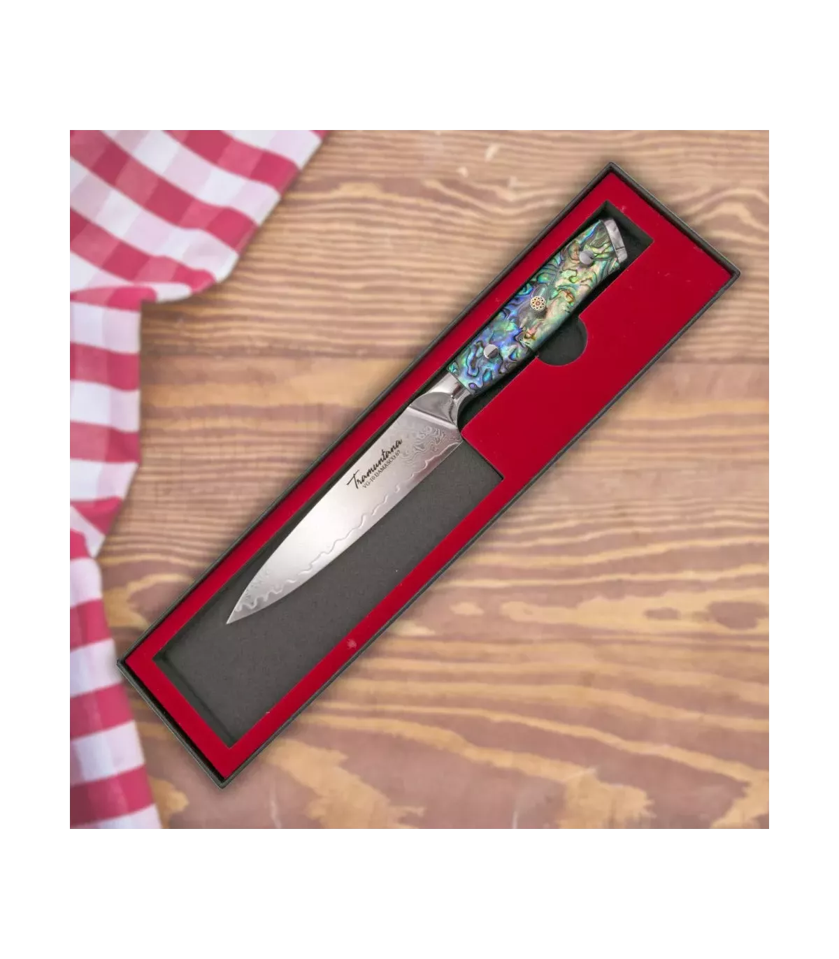 The handle, made of abalone and epoxy, offers an ergonomic and durable grip, as well as a visually striking design that adds a touch of sophistication. This high-quality material is resistant to moisture, allowing prolonged use without wear. The presentation in a box further enhances its appeal, making it an excellent option for gifting or displaying in any kitchen.