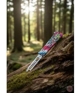 Imagina tener en la mano una herramienta que combina estilo impactante con funciones pensadas para emergencias, lista para actuar cuando más importa.Esta pieza destaca por su hoja con acabado irisado, que refleja...