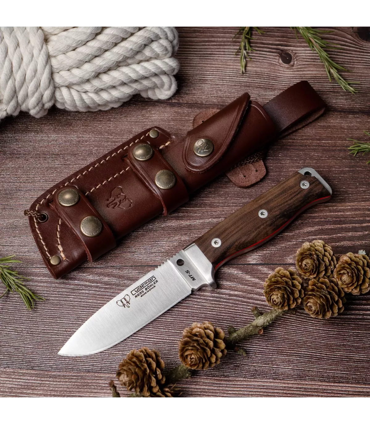 Fabricado en acero Böhler N-695, el MT-5 es de estructura enteriza con virolas de acero A-304 satinadas. Su mango es de madera natural de nogal con separadores rojos y consta de pomo percutor en el extremo final de su empuñadura. La cremallera en su lomo hace que el agarre sea seguro y fiable. Además, su funda multiposición con trabillas y remaches hace que lo puedas portar tanto vertical como horizontal, e incluye el adaptador para piedra y pedernal.