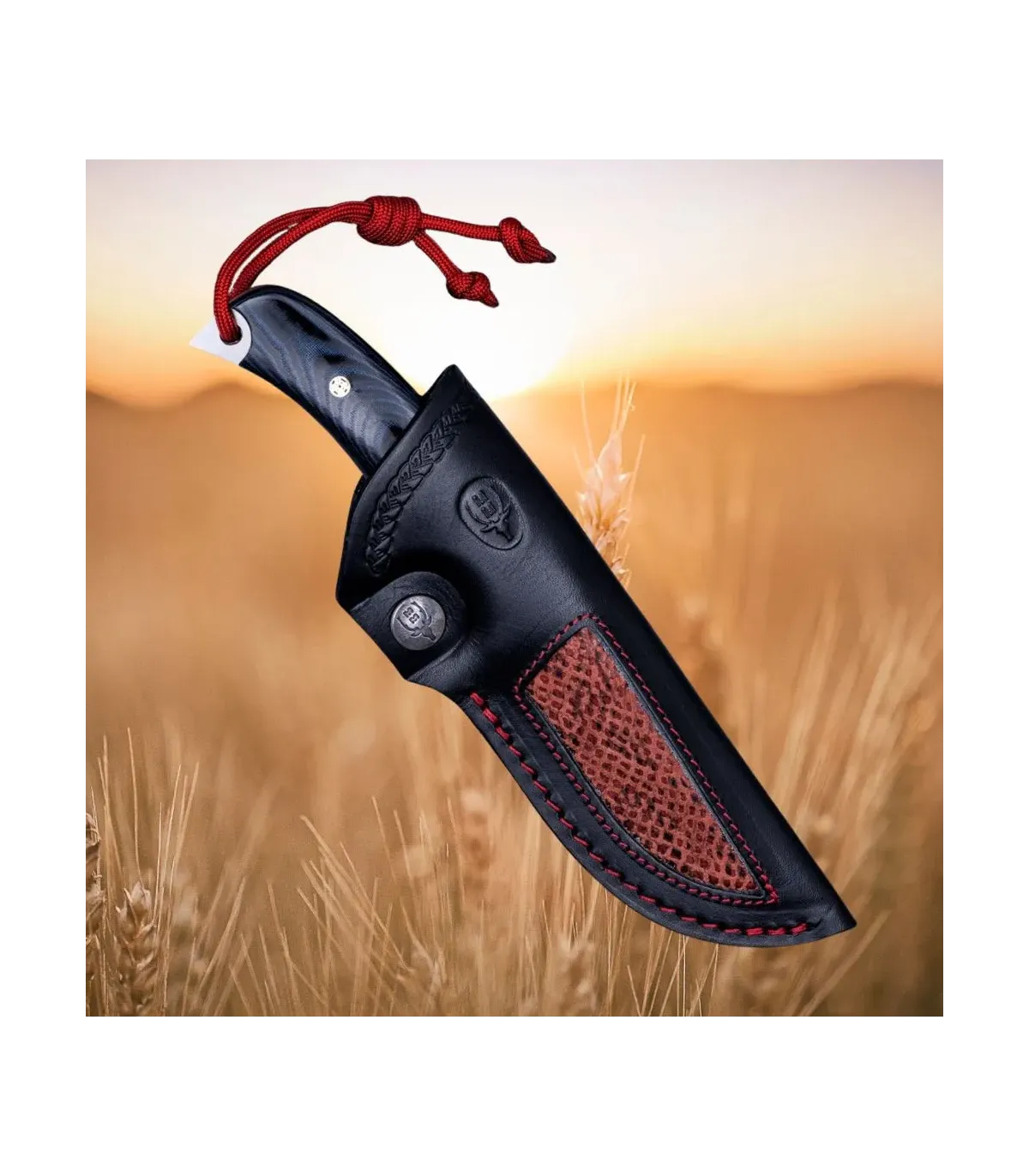 Su diseño curvado y la punta afilada garantizan que podrás realizar cortes precisos y eficientes, ya sea en tus excursiones de caza o en actividades al aire libre. La empuñadura de micarta negra y azul no solo es estéticamente atractiva, sino que también cuenta con un formato anatómico que favorece un agarre cómodo y seguro, incluso en condiciones exigentes.