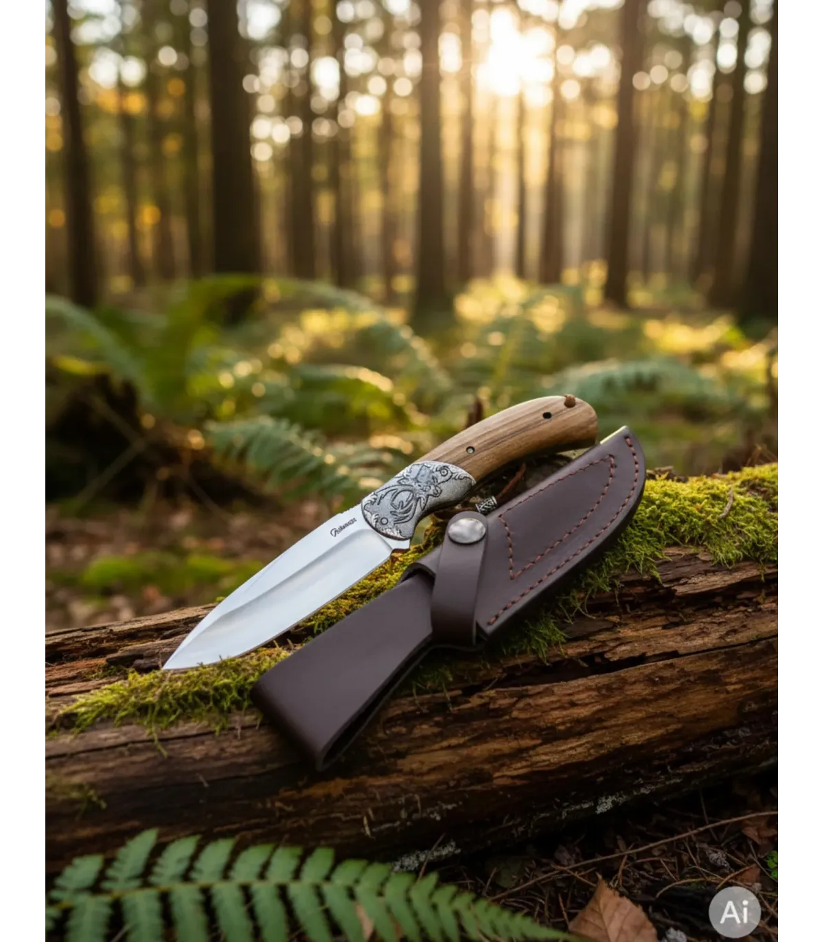 Incluye una funda de piel marrón con costuras visibles y cierre de botón a presión, combinando durabilidad y elegancia, perfecta para proteger tu cuchillo y llevarlo de forma segura. La virola de acero decorada le otorga un toque distintivo de estilo y robustez. Además, su presentación en caja color y cordón de polipiel lo convierten en un regalo ideal para amantes de la naturaleza o coleccionistas.