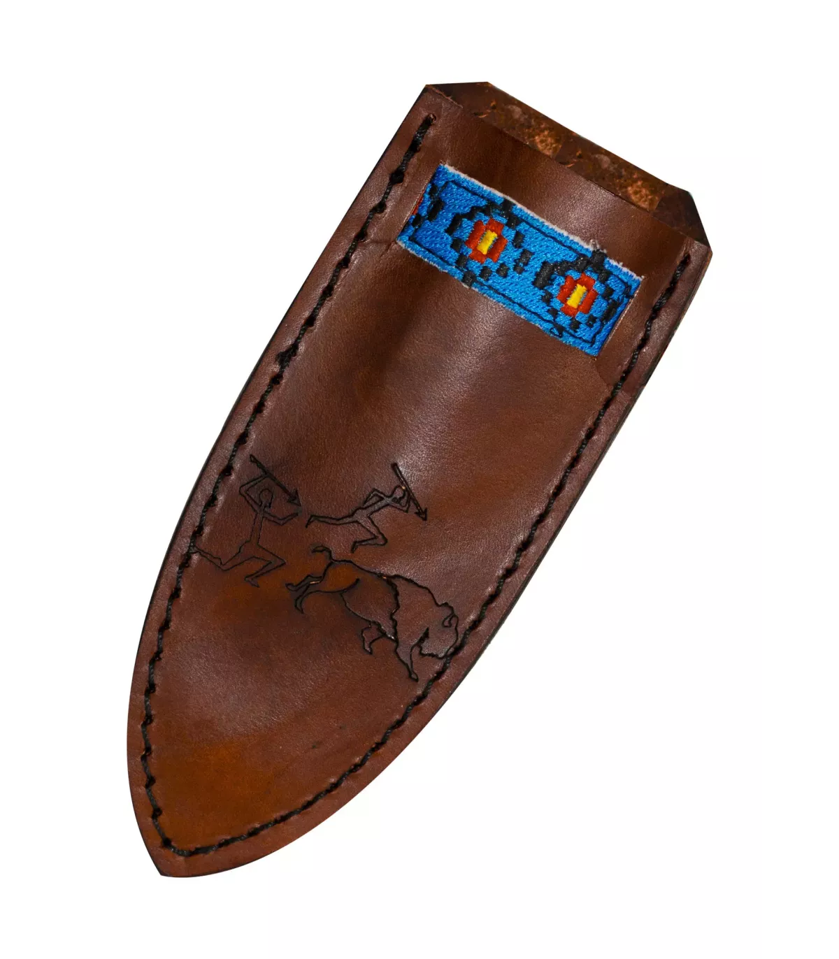 - Incluye funda de cuero artesanal: El Blue River Skinner viene acompañado de una funda de cuero hecha a mano, adornada con una escena de caza de búfalos y un colorido paño con patrón indígena. Esta funda no solo proporciona protección para tu cuchillo, sino que también añade un toque de estilo y autenticidad a tu equipo.