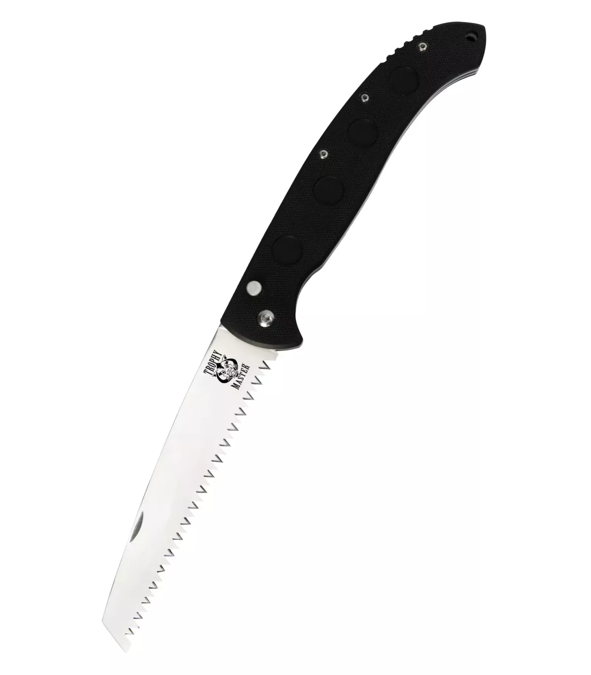 Juego 3 cuchillos de caza Trophy Master que se compone de un cuchillo de carnicero de espiga completa, un cuchillo desollador de hoja fija y un cuchillo de sierra plegable. Cada pieza cuenta con una hoja de acero inoxidable afilada con un mango G-10 resistente y antideslizante.