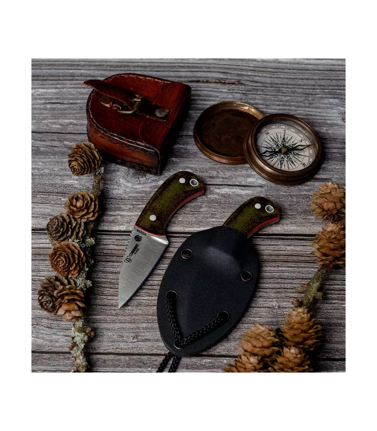 Cuchillos enterizo Yoda Kydex de Cudeman con hoja satinada tipo punta de aguja (needle-point) fabricada en acero Böhler N-695. La empuñadura está remachada con aluminio plano y tiene agujero para cordón fiador y está hecha con Micarta canvas con separador rojo. Incluye funda tipo kydex, paracord para colgar en el cuello y cremallera en el canto para mejorar el agarre.