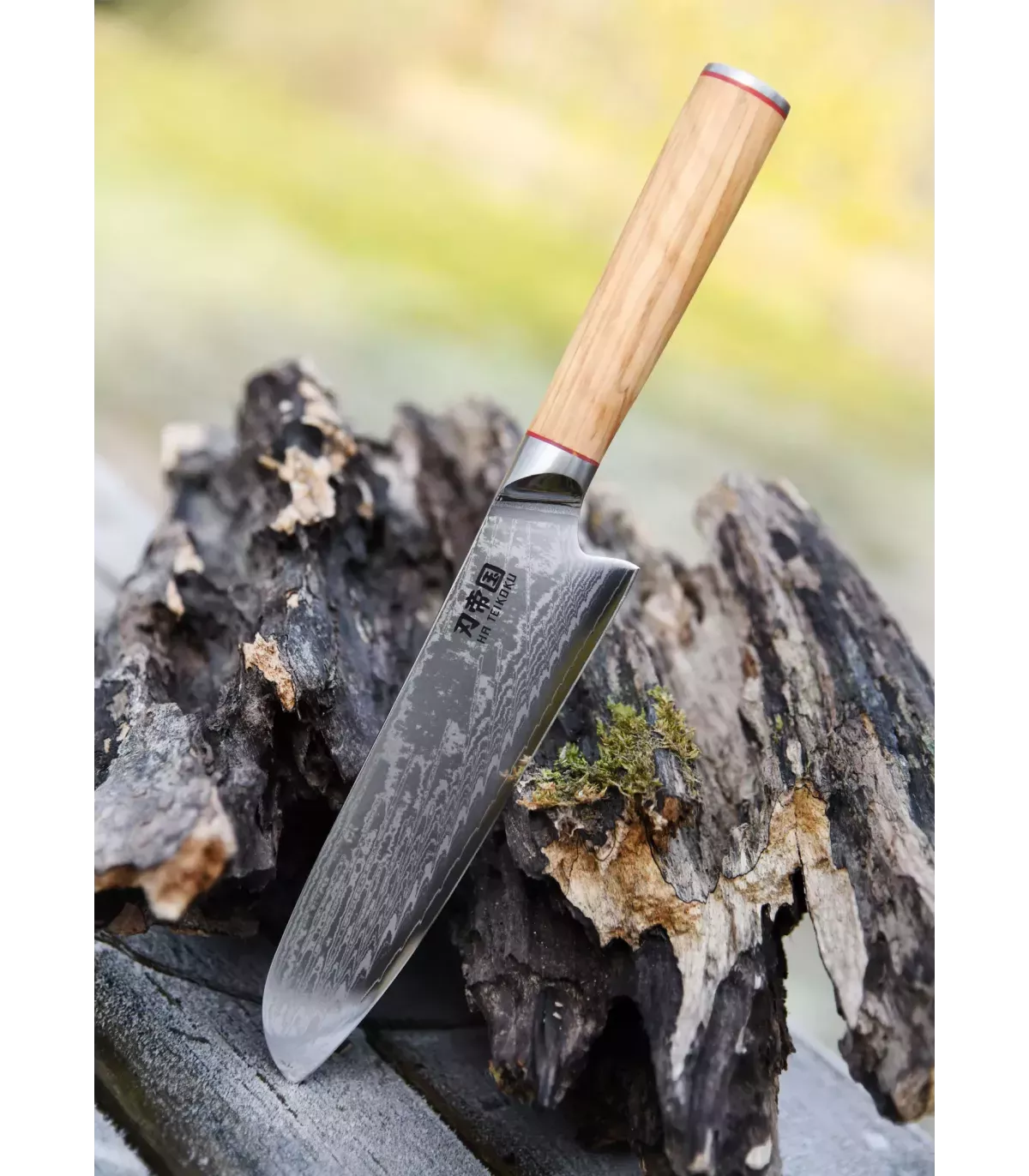 Cuchillo de cocina Santoku con hoja en acero de Damasco de 67 capas. La hoja afilada de este cuchillo de cocina le permite realizar prácticamente todas las tareas de corte en un abrir y cerrar de ojos. El elegante mango de madera de olivo se adapta cómodamente a la mano y proporciona un agarre seguro al cortar.
