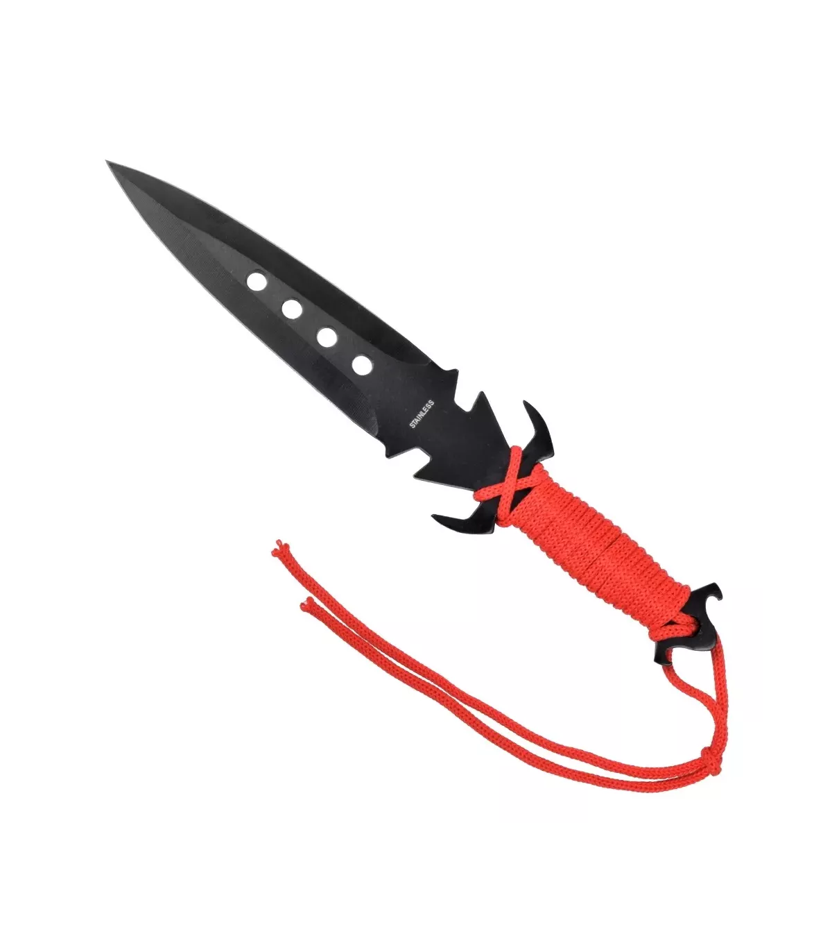 Lleva tu estilo personal al siguiente nivel con los lanzadores de fantasía Calaveras. Este set de 3 lanzadores presenta un diseño único y llamativo, con dibujos de 3 calaveras rojas en la hoja y una empuñadura envuelta en cordón rojo. Fabricados con construcción de acero inoxidable de alta calidad, estos lanzadores tienen un acabado negro en la hoja para mayor durabilidad y estilo. Con una longitud total de 190mm y un peso de 54g por lanzador, son fáciles de manejar y vienen con una funda de nylon con presilla para cinturón para su transporte seguro y conveniente.