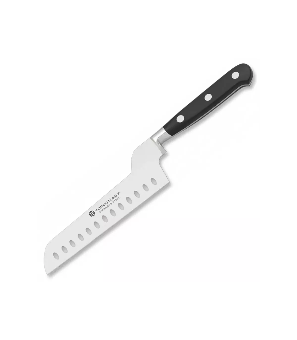 Descubre el Cuchillo Quesero Profesional Francés de la prestigiosa marca Top Cutlery. Con una hoja de 17 cm, este cuchillo es perfecto para cortar y servir tus quesos favoritos con precisión y estilo. La hoja de acero inoxidable presenta un acabado satinado y alveolado, lo que facilita el corte y evita que el queso se adhiera al cuchillo.