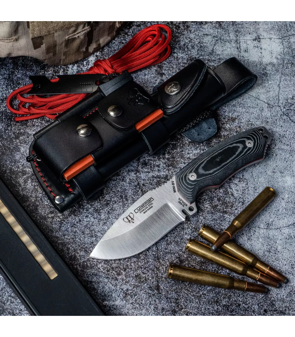 Este cuchillo es perfecto para salidas al campo, misiones tácticas o cualquier tarea de corte que necesites realizar. Además, su funda de cuero negro de primera calidad con cosidos rojos es multiposición, lo que te permite llevarlo cómodamente contigo en cualquier situación. En su versión completa, incluye un adaptador de cuero con espejo de señales, piedra de afilar, paracord 550 rojo y pedernal, convirtiéndolo en un cuchillo polivalente con todos sus accesorios al completo. ¡No esperes más y hazte con el Cudeman Mini Boina Verde, el cuchillo táctico más compacto y eficaz del mercado!