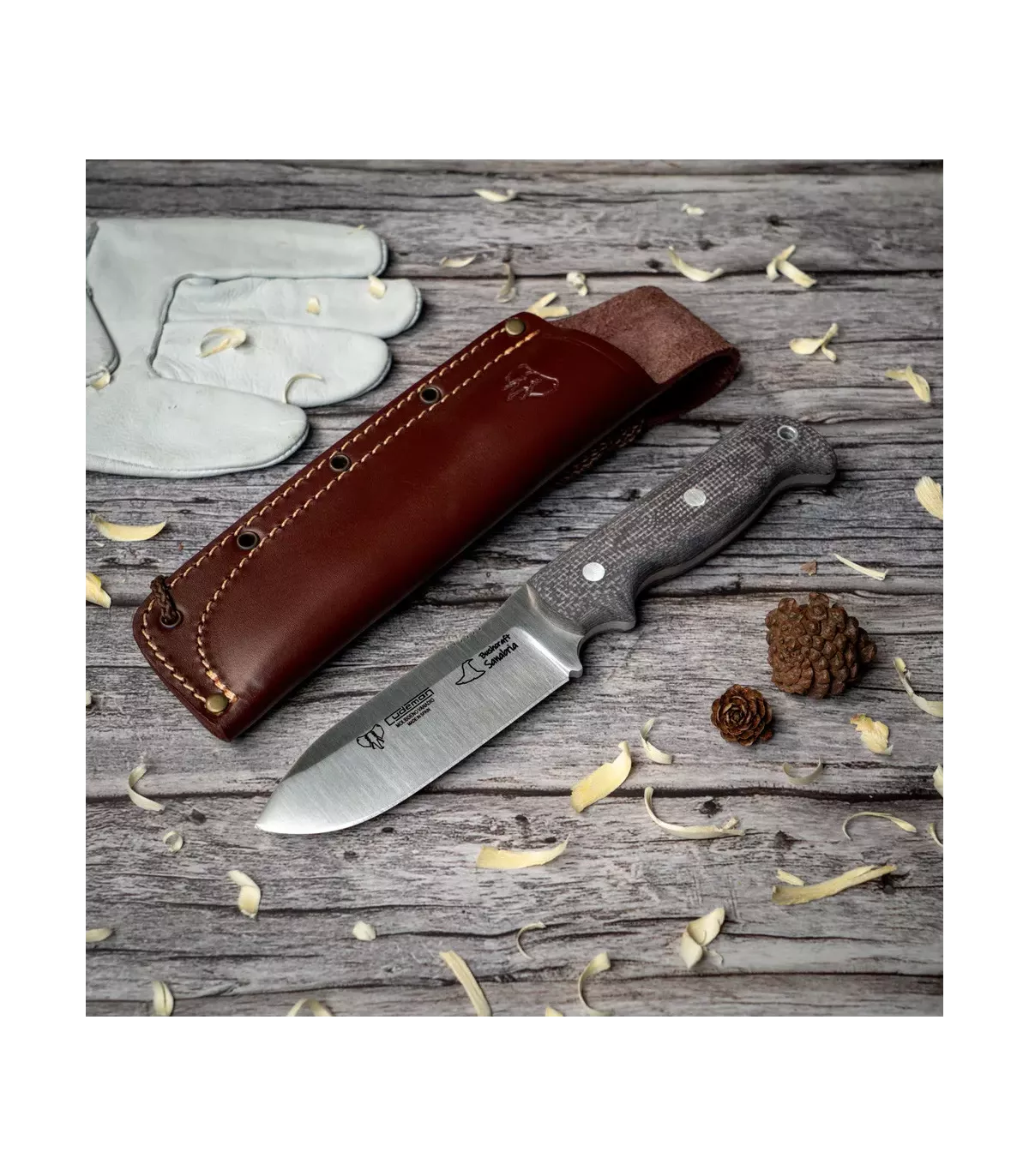 El Cuchillo Cudeman Bushcraft Sanabria es la herramienta definitiva para cazadores y amantes de la supervivencia. Su robusta hoja enteriza de acero Molibdeno Vanadio con punta Drop-Point te ofrece la máxima resistencia y durabilidad. La empuñadura de yute negro proporciona un agarre seguro y cómodo, mientras que su diseño incluye una cremallera en el lomo y un empujador integrado, ideal para actividades bushcraft.