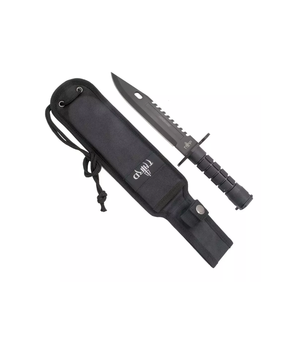 El cuchillo táctico Third modelo Mercenario Black también viene con un acople en el mango para carril R.I.S. lo que te permite personalizarlo y adaptarlo a tus necesidades específicas. Además, cuenta con una funda de nylon para que puedas transportarlo de forma segura y fácil. Ya sea para uso militar o civil, este cuchillo táctico es la elección perfecta para cualquier persona que valore la calidad y la durabilidad.